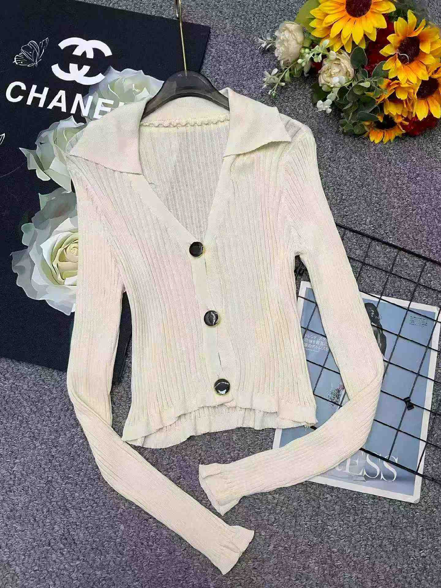 This batch includes 140 spring new Korean-style Chanel-inspired stand collar ice silk knit cardigans. One size with soft, stretchy fabric, each piece is individually packaged, available for bulk wholesale at CNY6.4 per piece.