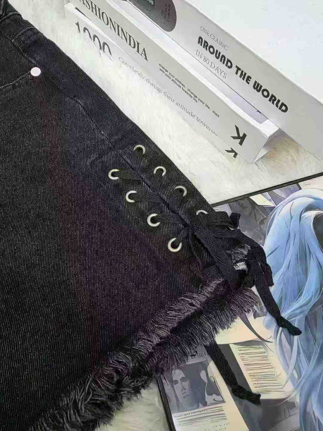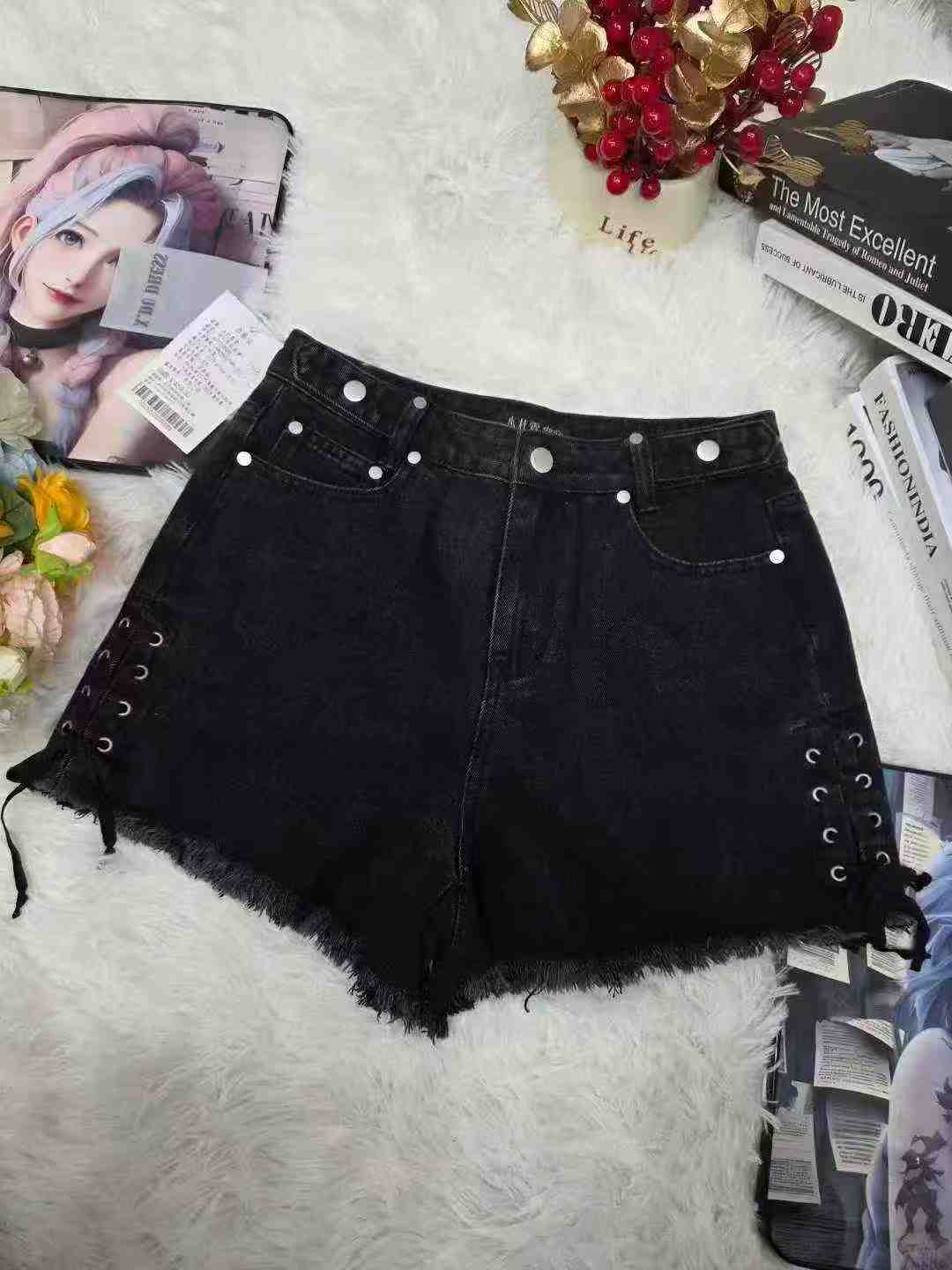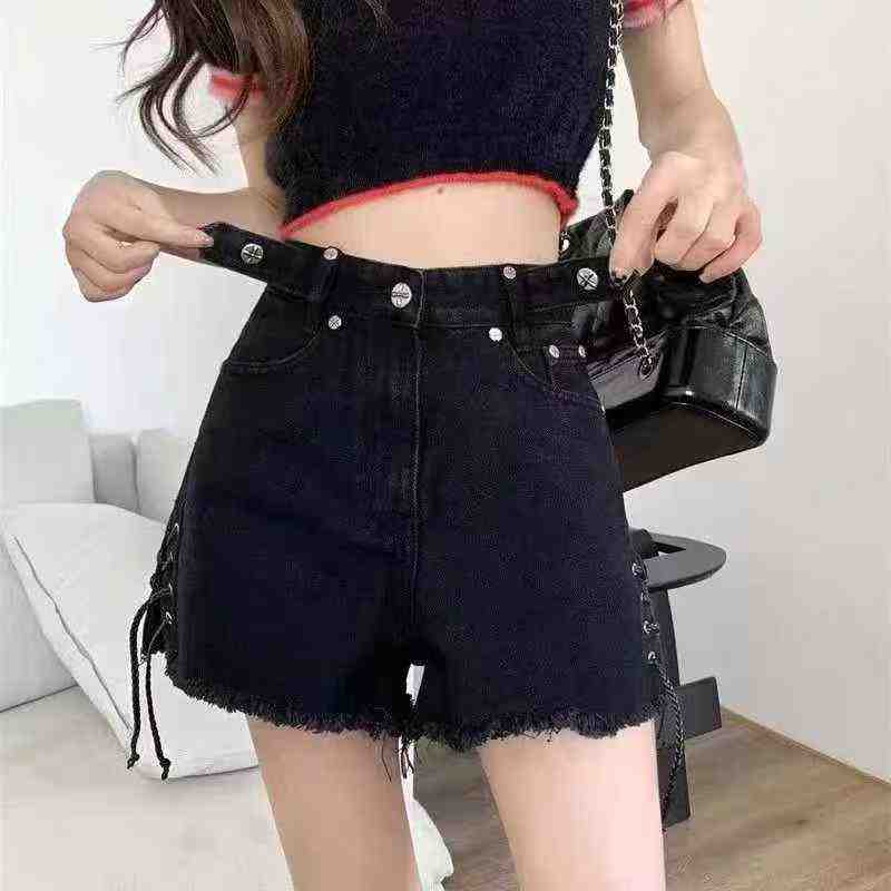 153 Pcs Women’s American Sweet Spicy Style Black Denim Shorts Summer Frayed Tie A-line Hot Pants Sizes M-L