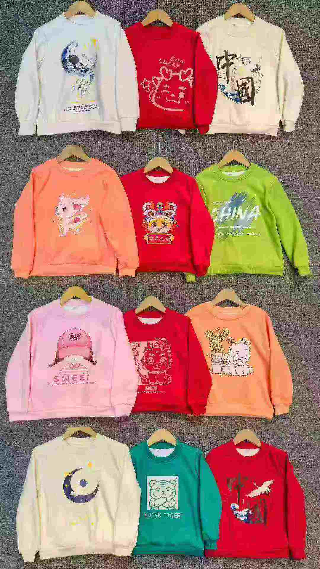 As a trusted stock lot supplier, we present these Chinese clothing stock lots for wholesale export. This batch includes 1560 pieces of quality stock clothing – fall-winter crew neck fleece sweatshirts designed for kids and teens. Featuring inner baby fleece, back neck binding, and dopamine prints, they come in assorted colors, designs and sizes 110-170, with each piece packed in a waterproof bag for cleanliness. This bulk clothing wholesale option offers great value, ideal for businesses looking to source cost-effective stock apparel in large quantities.