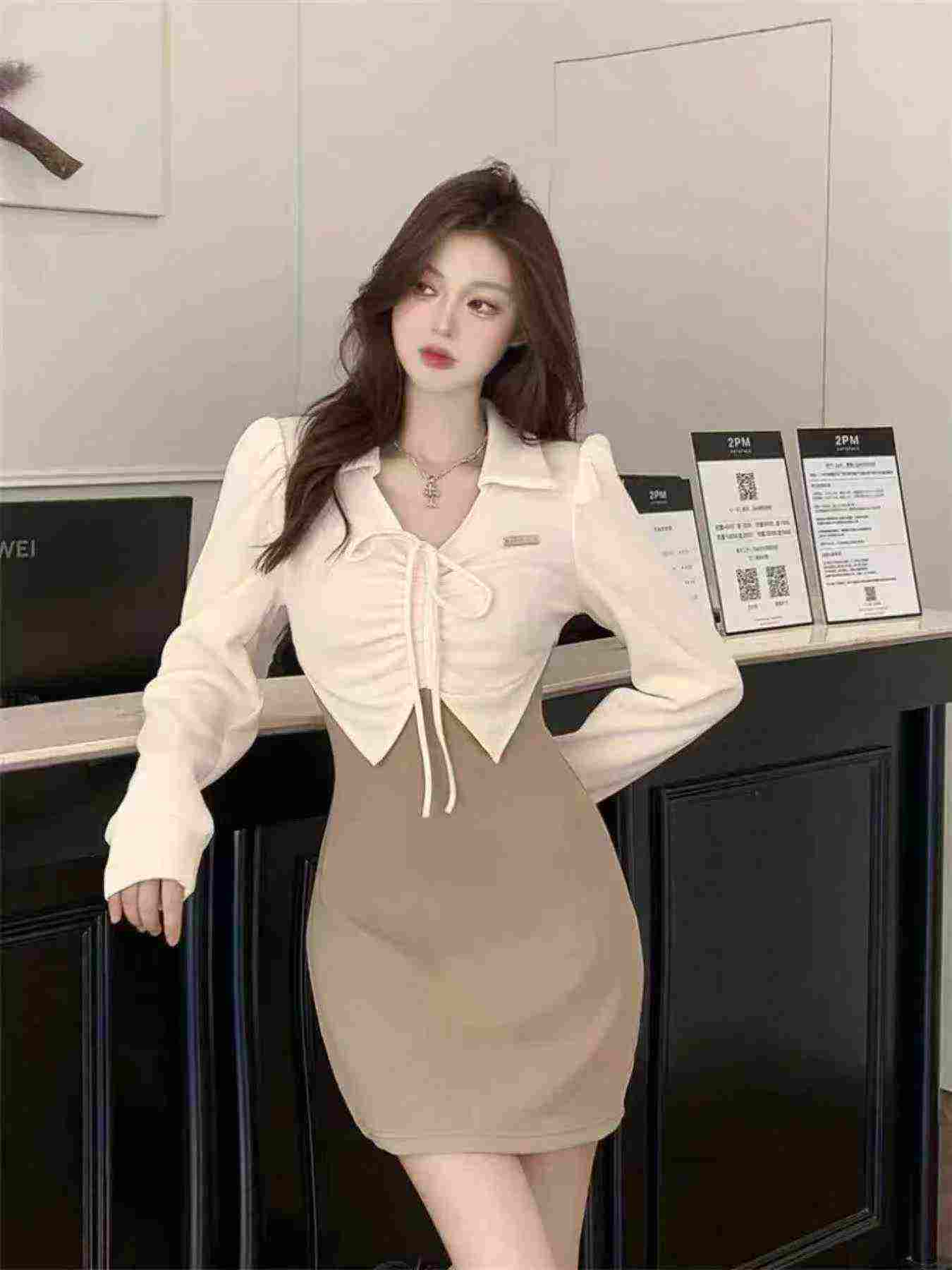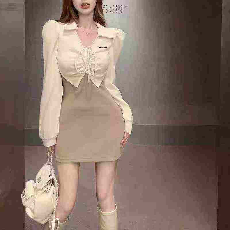 166 Pcs Elegant High Elastic Dresses Bulk Stock – Polo Neck Fake Two-piece Contrast Drawstring Dress Wholesale