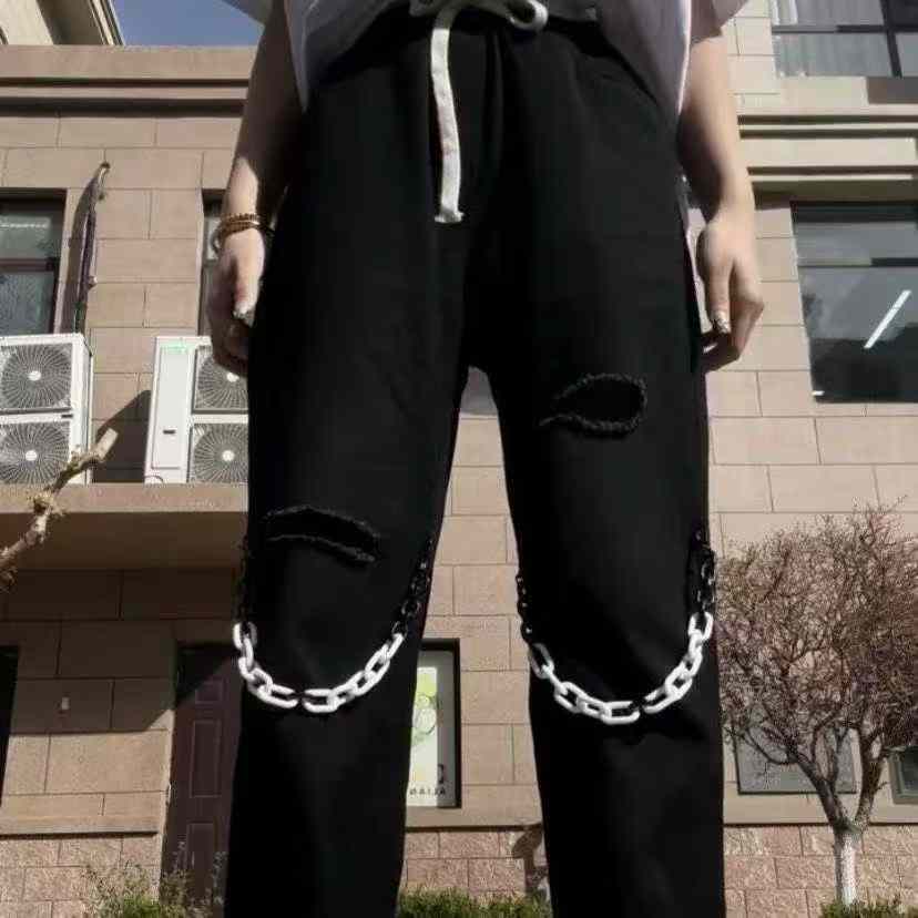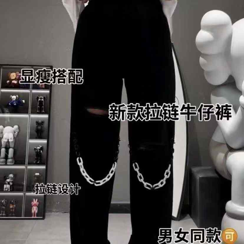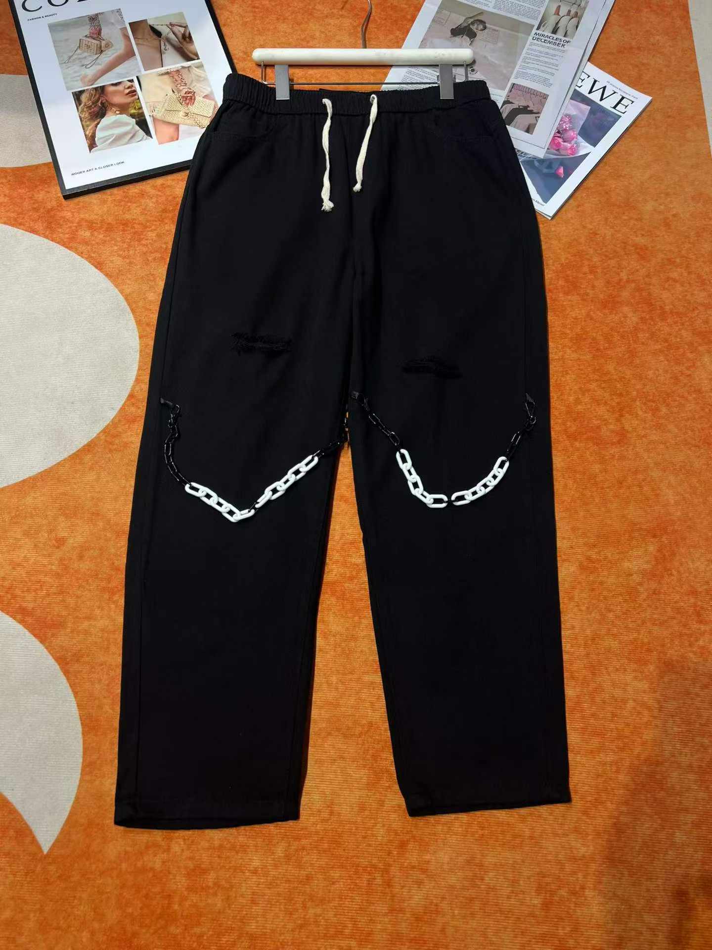 These trendy unisex chain jeans are from Chinese clothing stock lots, offer great value for bulk clothing wholesale, available for wholesale export from a professional stock lot supplier