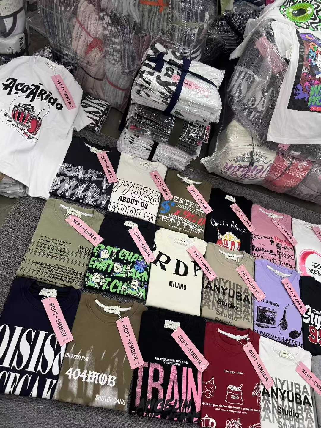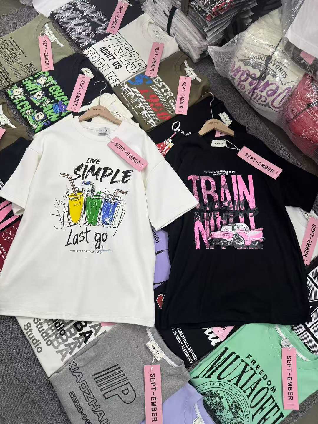This batch includes 6000 pieces of 300g heavy weight oversized trendy t-shirts. All pieces feature shoulder binding and uniform hang tags, ideal for bulk purchase for resale business.