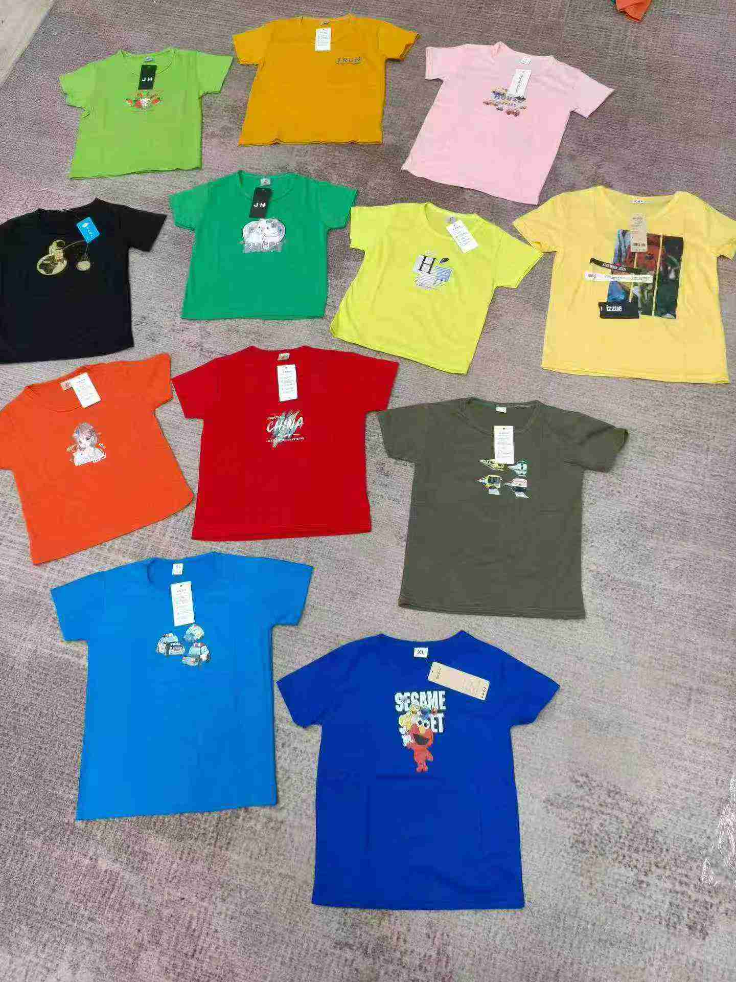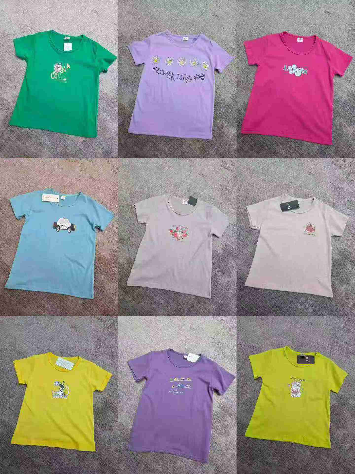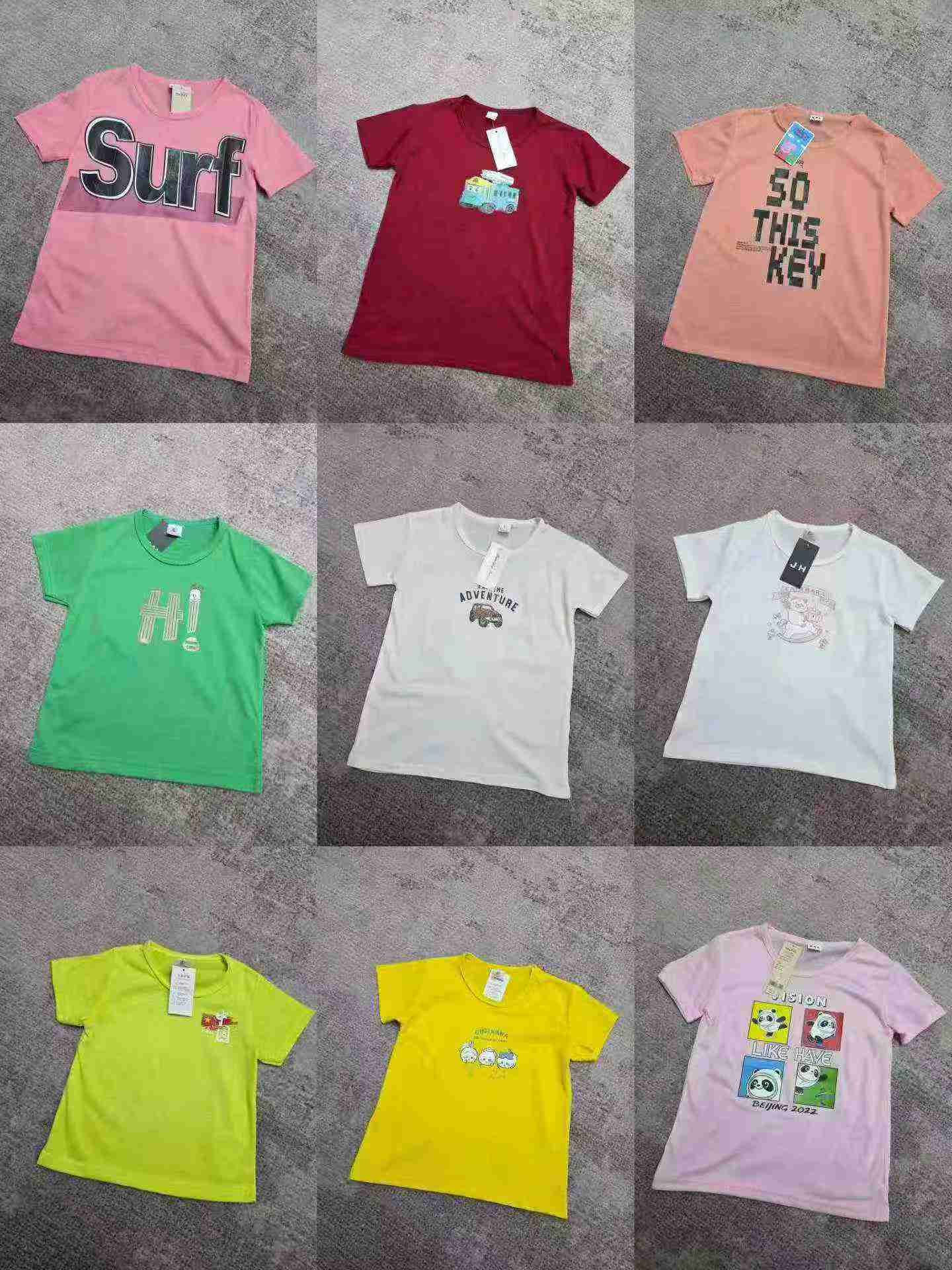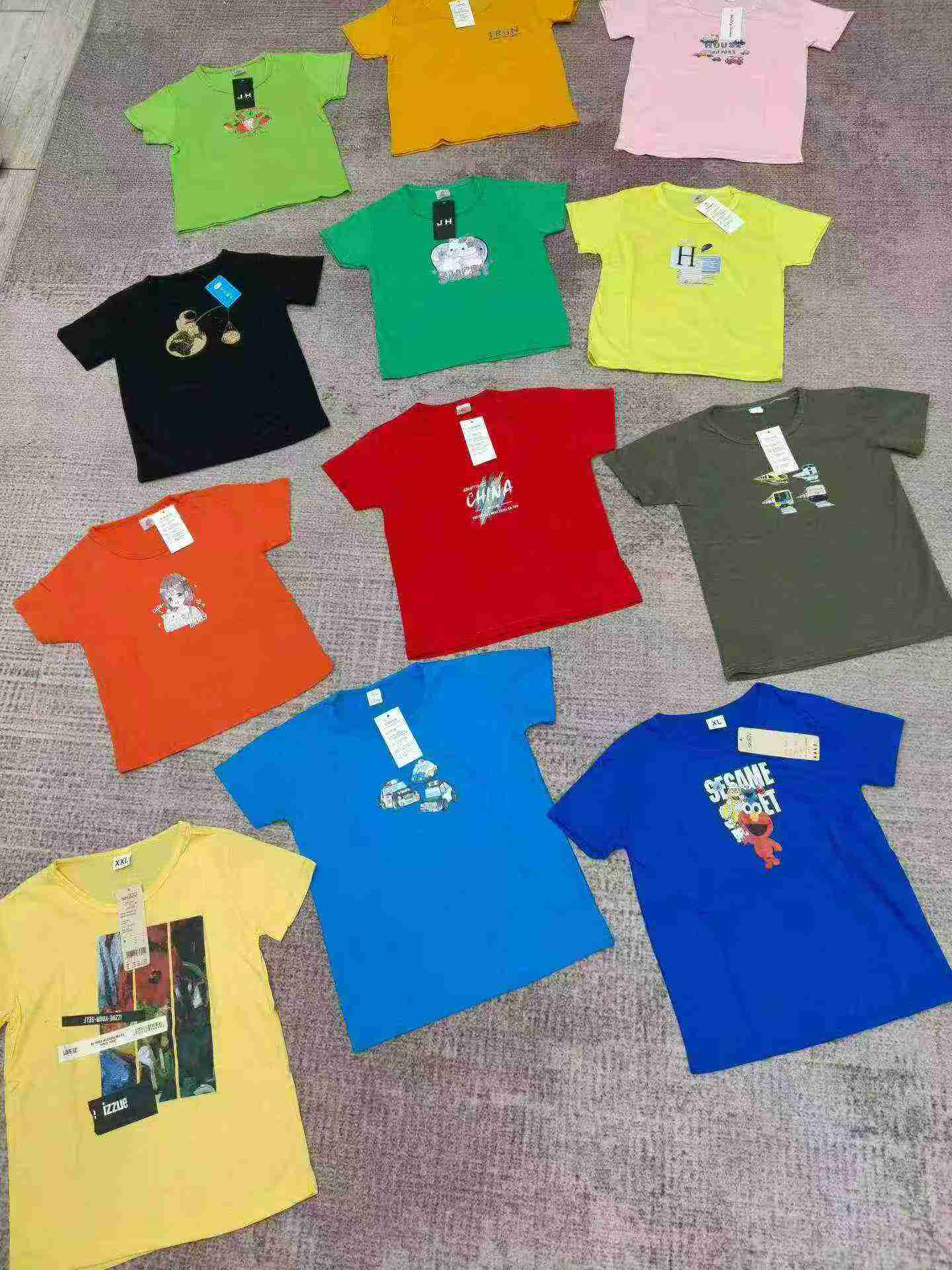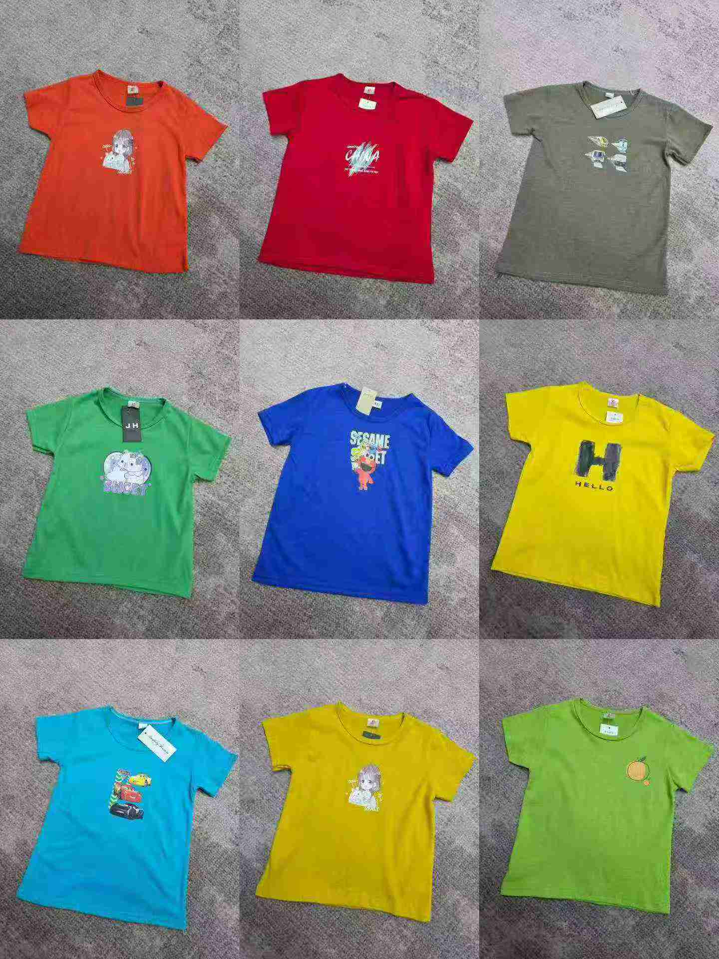 35000 pieces of candy-colored cotton kids’ short sleeve T-shirts are available in stock. Sizes range from M to 2XL. Each piece comes with individual packaging and a tag, featuring various patterns not limited to reference images.