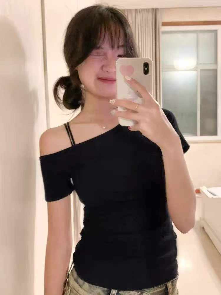 650 pieces of summer trendy retro one-shoulder printed T-shirts, soft stretch fabric, mainly solid colors, these are quality Clothing Stock Lots for bulk wholesale.