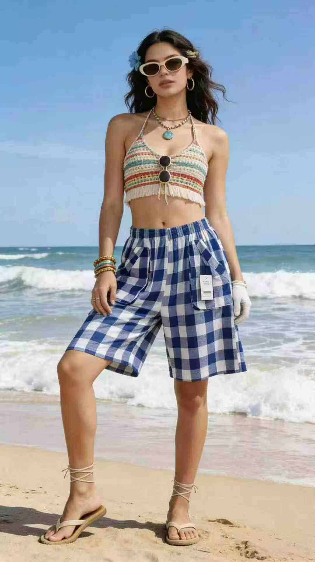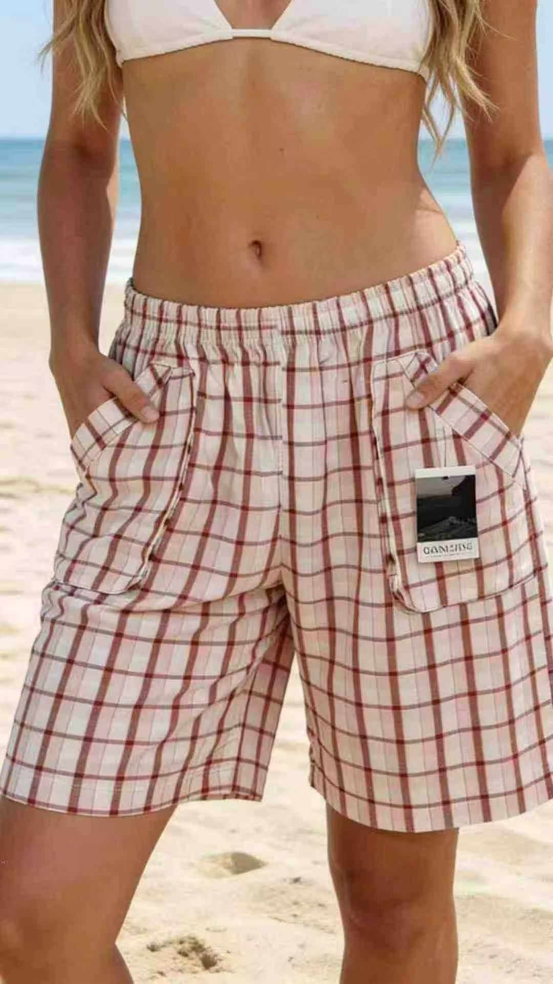 This group of products belongs to our Clothing Stock Lots, we have about 5070 one-size pure cotton plaid beach shorts with individual packing, loose fit and multiple colors.