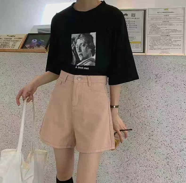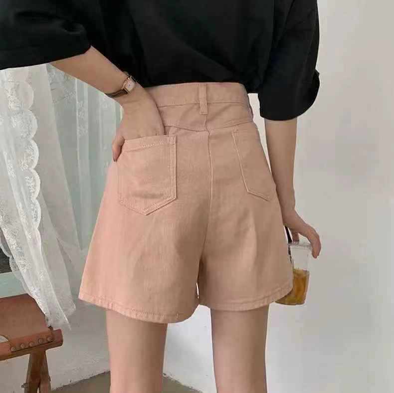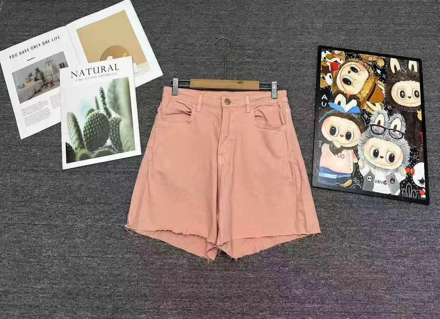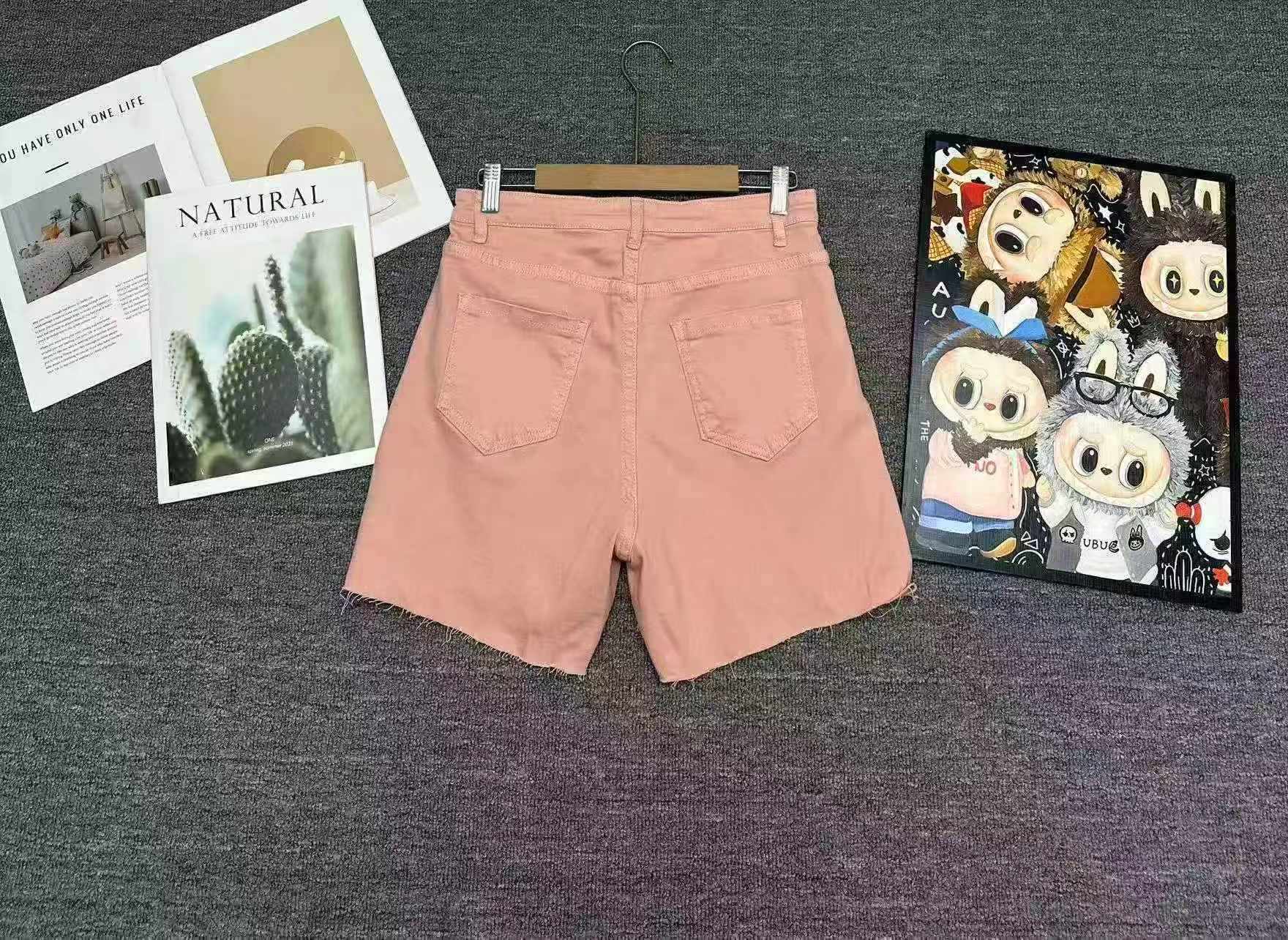 This is Clothing Stock Lots of around 128 pieces women’s pink high-waist denim shorts, soft elastic fabric, sizes S-XL with individual packaging.