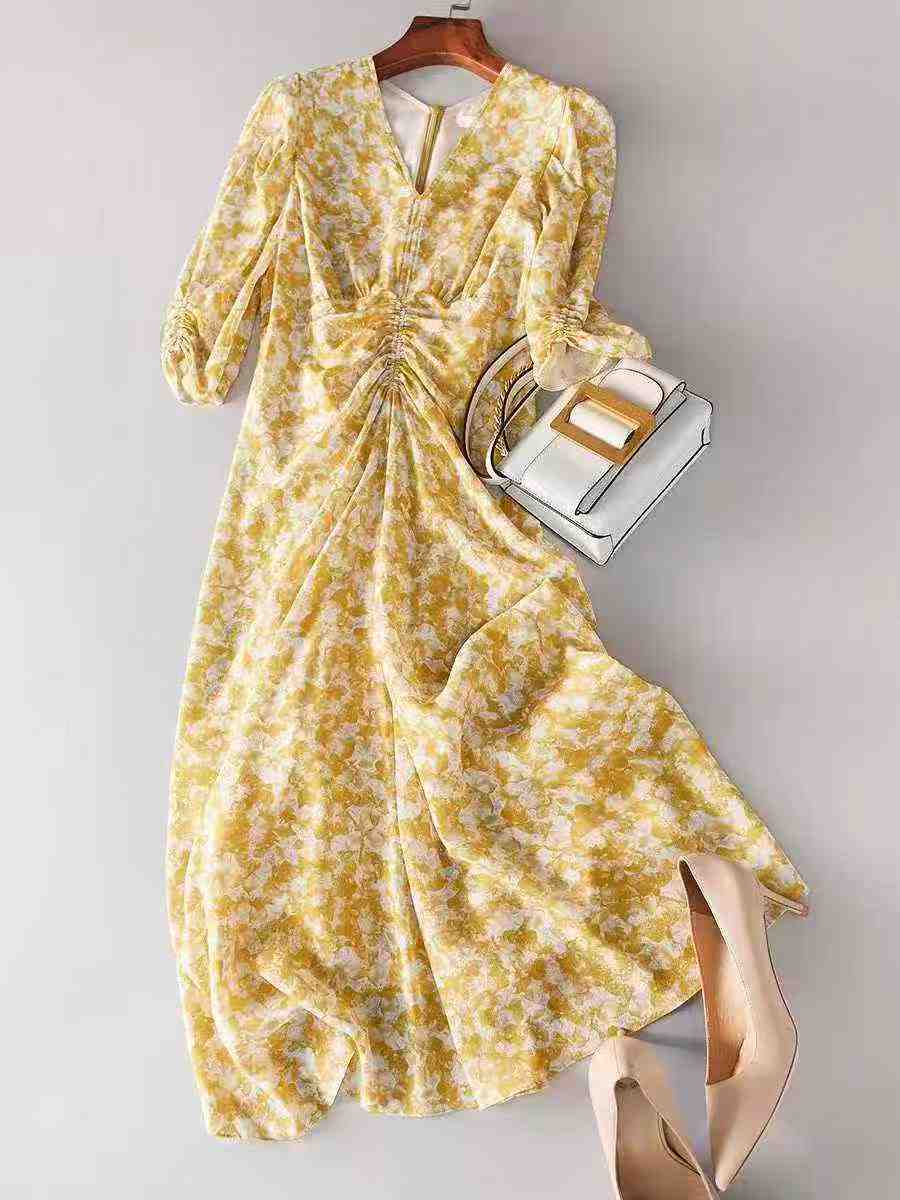 Bulk Wholesale French Tea Break Yellow V-neck Floral Women’s Slim Waist Long Dresses Chinese Clothing Stock Lots