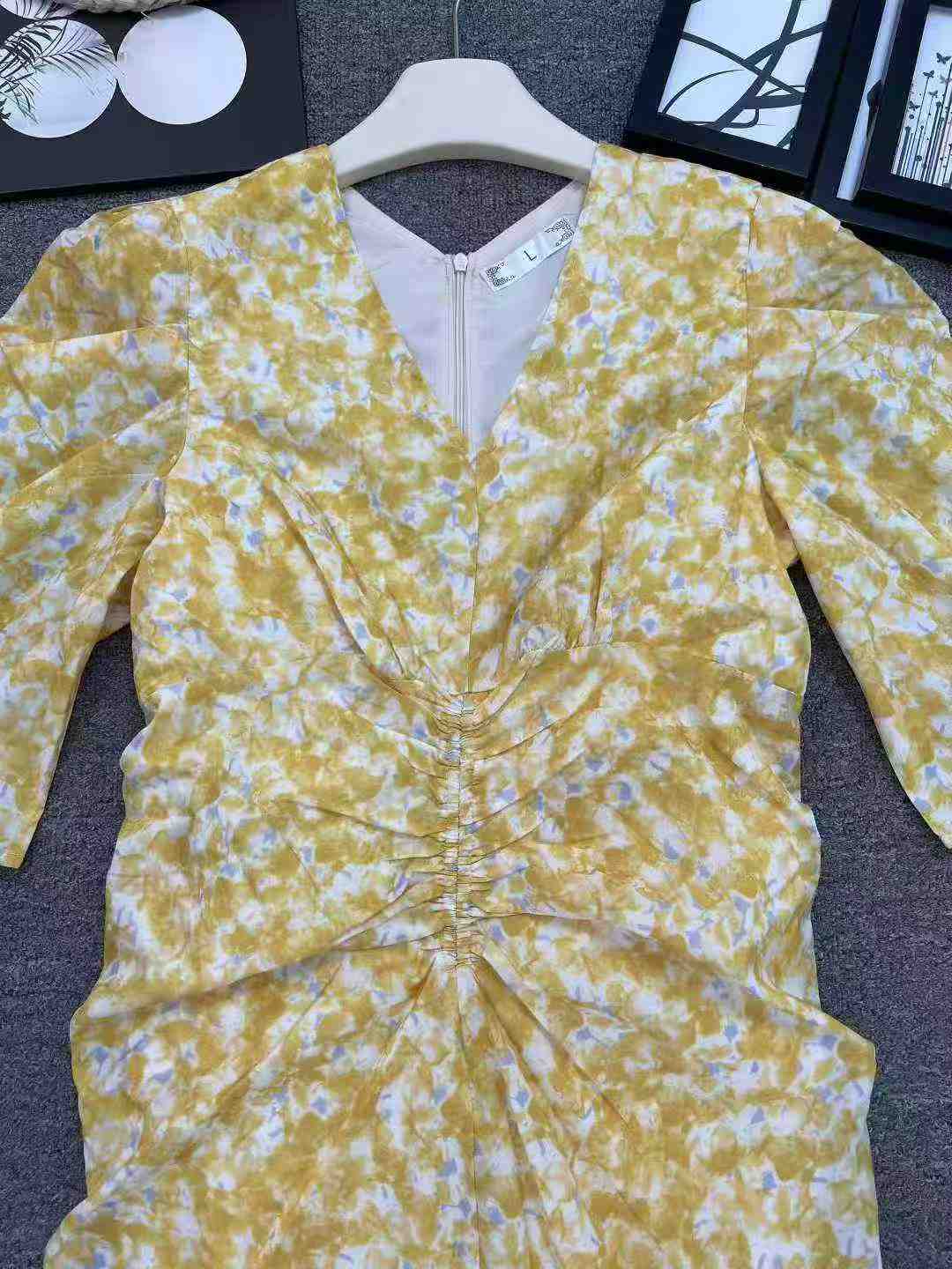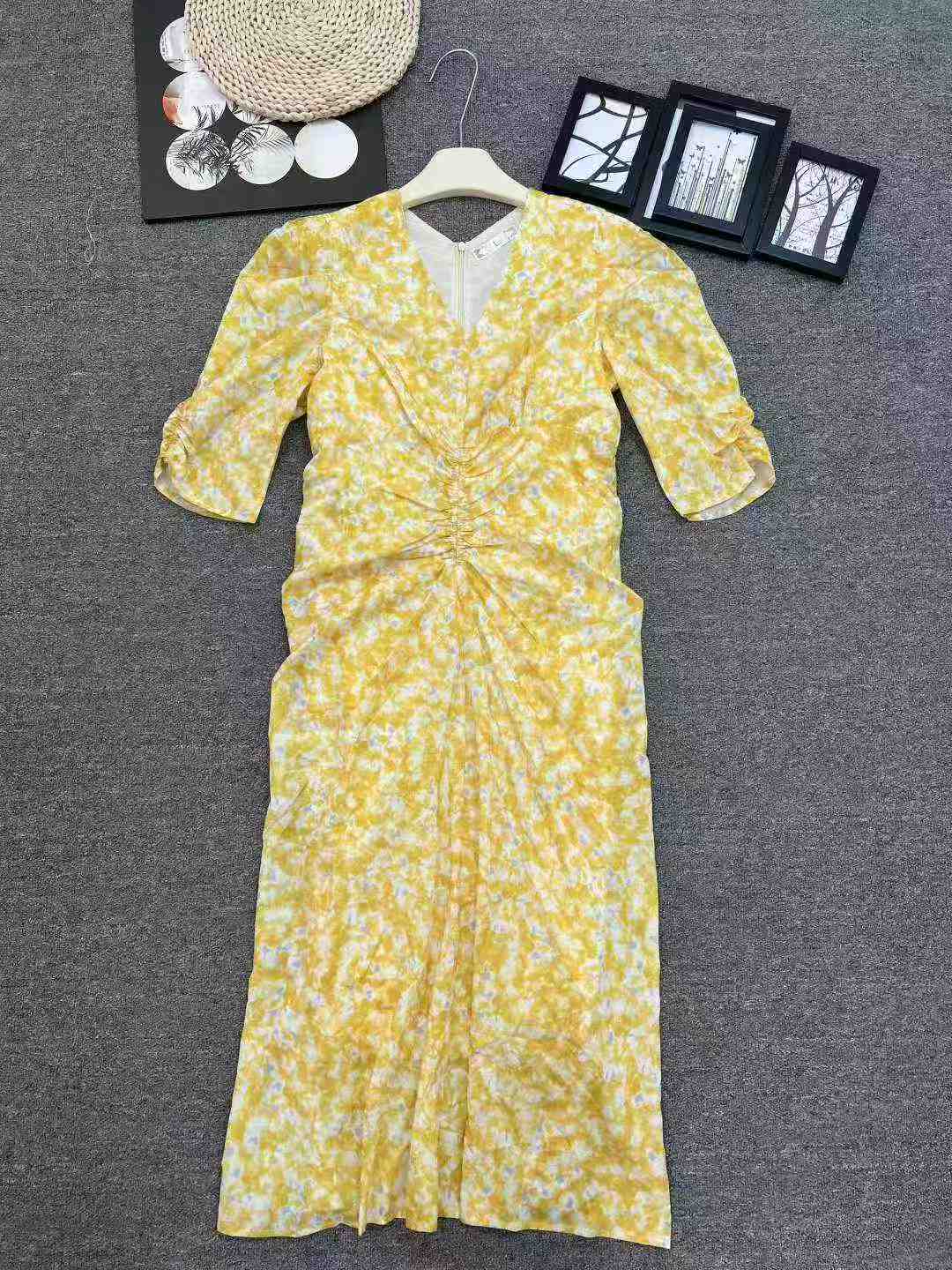 As a professional stock lot supplier, we provide quality stock clothing for global buyers, and this batch of women’s summer dresses is a great value option for your bulk clothing wholesale business. We support wholesale export of Chinese clothing stock lots. This item is a French style tea break dress for women, with yellow floral print, V-neck design, slim waist cut and long length. All pieces come with lining, individual packaging, single style and single color, available in sizes ranging from S to XL, with a total of 144 pieces for whole clearance.