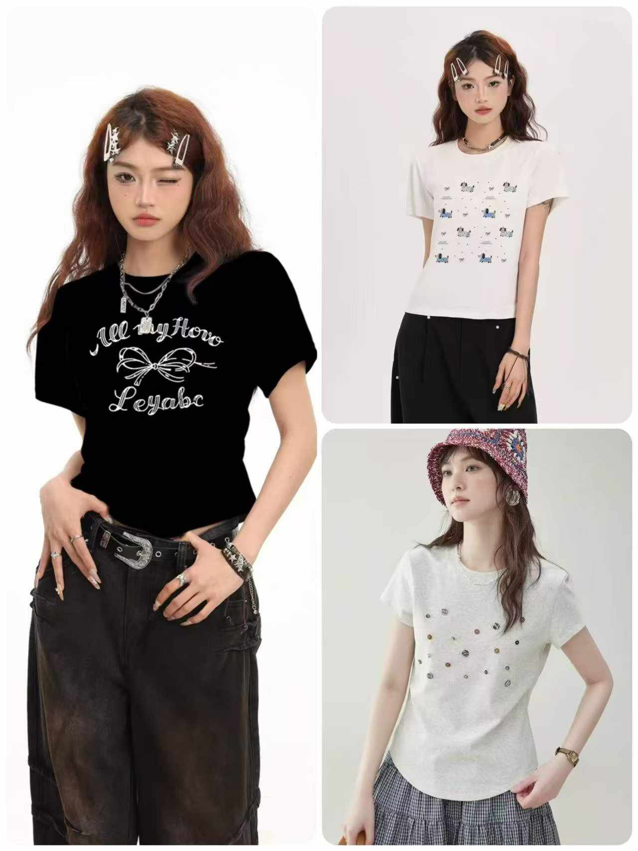 We are a professional Chinese stock lot supplier offering this batch of trendy cropped T-shirts as part of our Chinese clothing stock lots for bulk clothing wholesale. This lot includes 3000 pieces of new trendy brand-style cropped T-shirts for young girls, made of soft breathable pure cotton fabric, finished with eye-catching heavy rhinestone craft. It features great cut and fit, and each piece comes with independent packaging and original hang tag. One size fits most people weighing 40kg to 65kg. For wholesale export, this is quality stock clothing that offers great value for resellers looking for affordable bulk inventory.