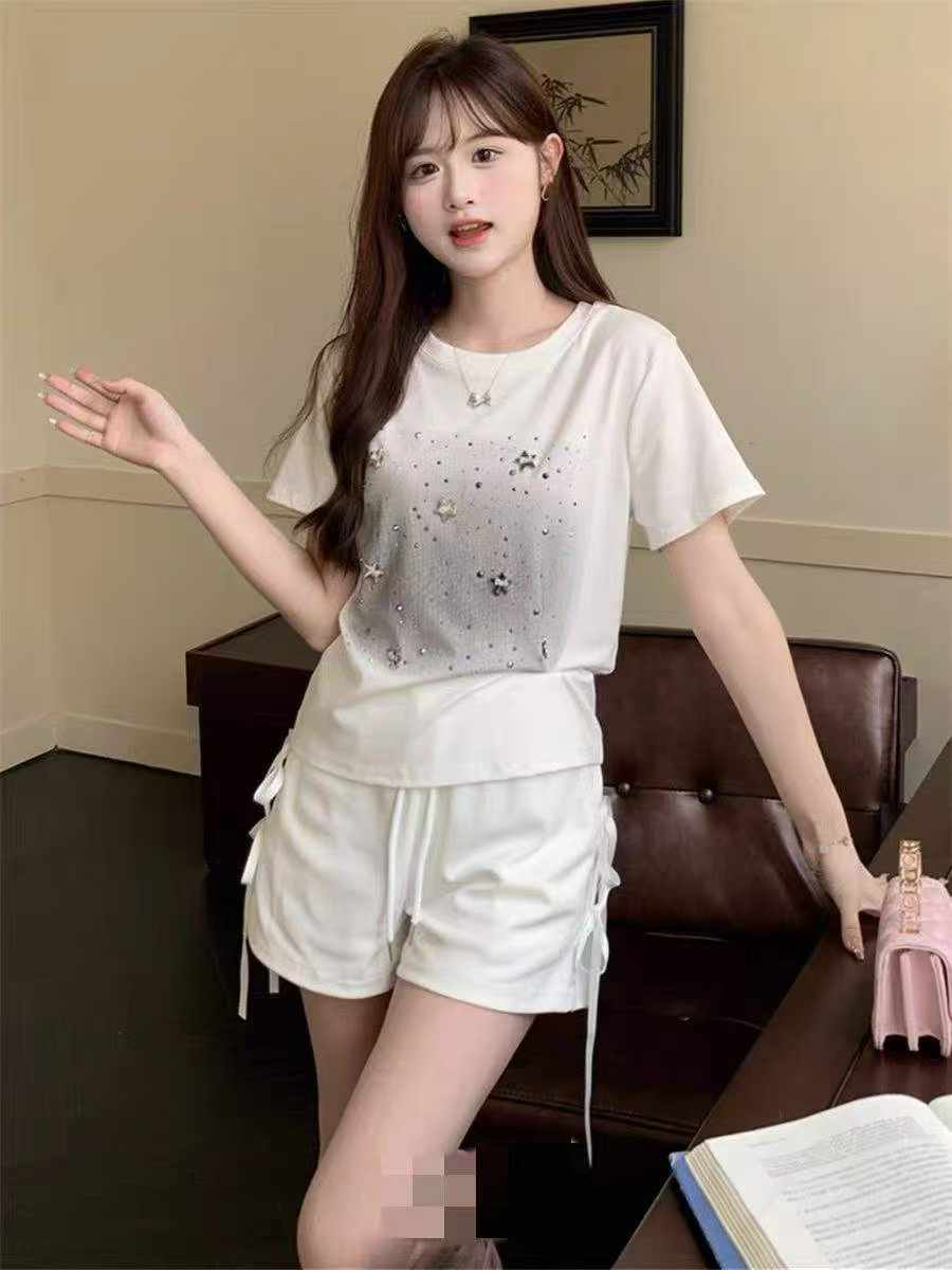 Clearance Sale 3000PCS New Trendy Brand Cotton Heavy Rhinestone Cropped T-Shirts Stock Wholesale Export