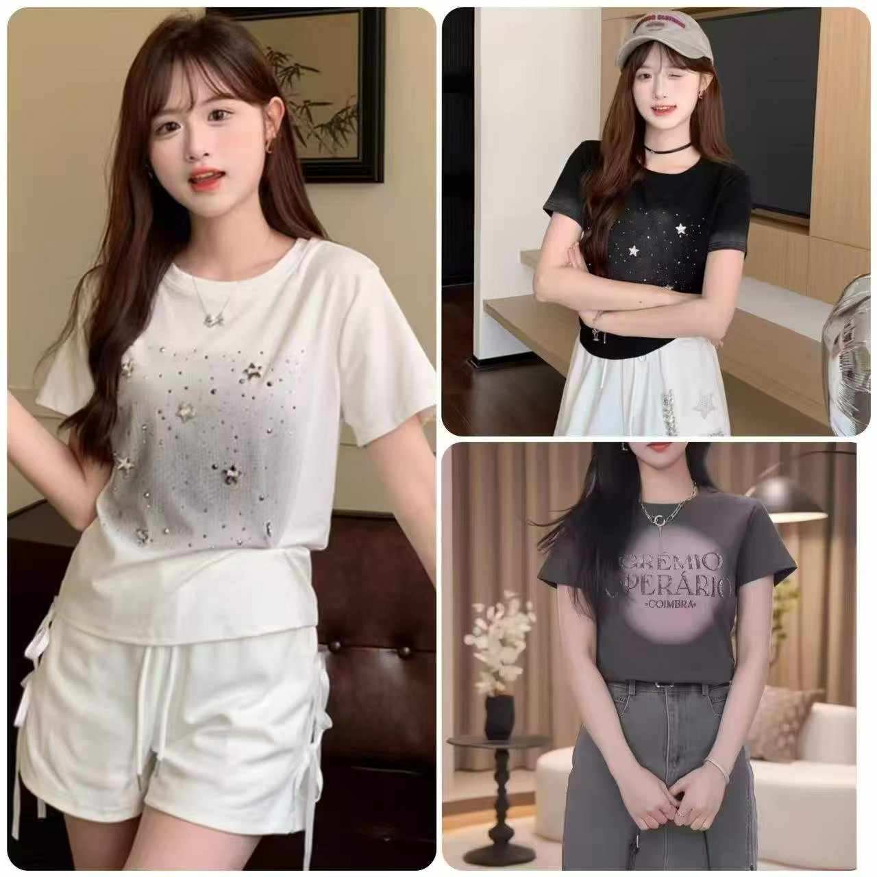 This batch includes 3000 pieces of new trendy cropped T-shirts for young girls. One size fits most people weighing 40kg to 65kg. Made of soft breathable pure cotton, decorated with heavy rhinestone, each piece comes with independent packaging and hang tag.