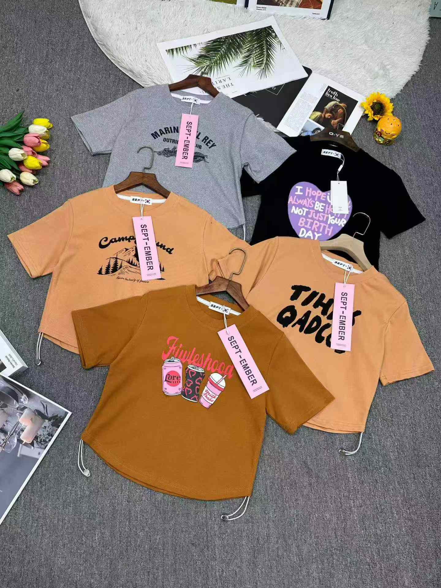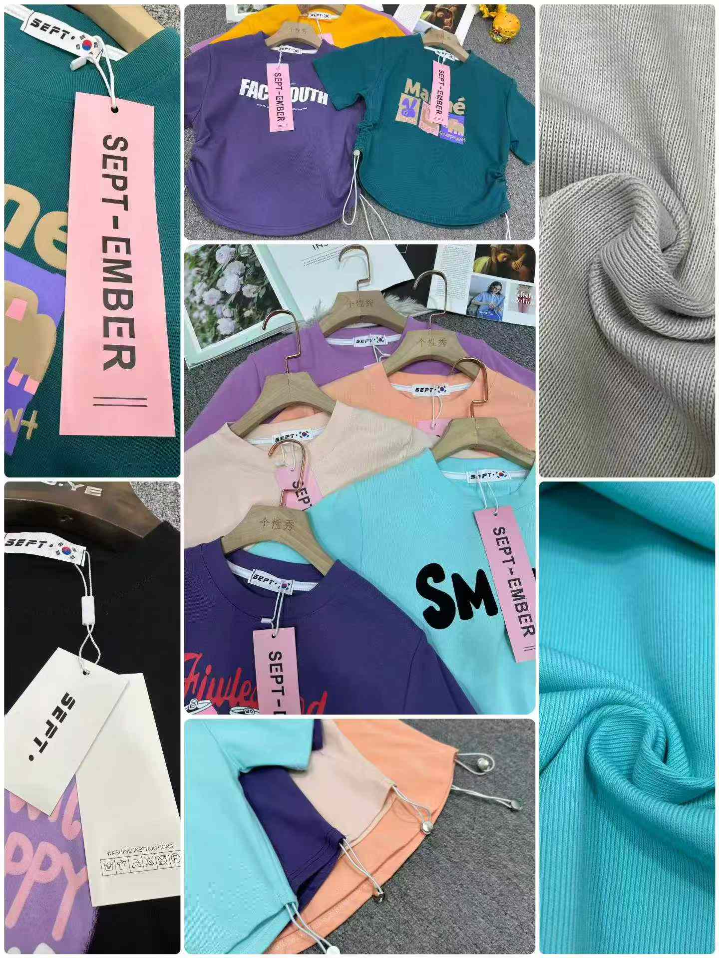 Total 3000 pieces available from Guangzhou Shisanhang fashion market. These are women’s trendy cropped drawstring cotton T-shirts, fit 45kg-65kg, with soft elastic fabric, individual packing and hang tags.