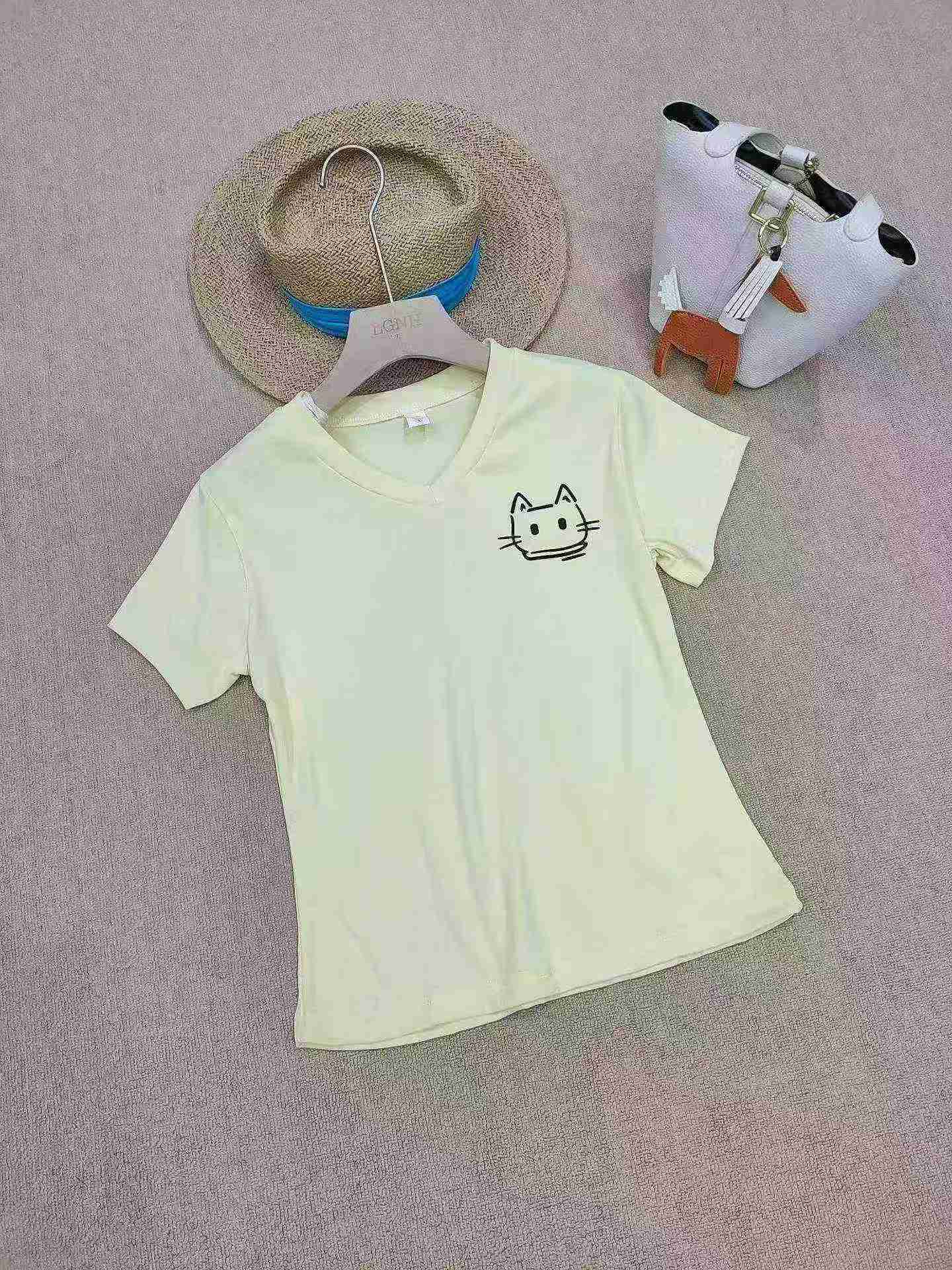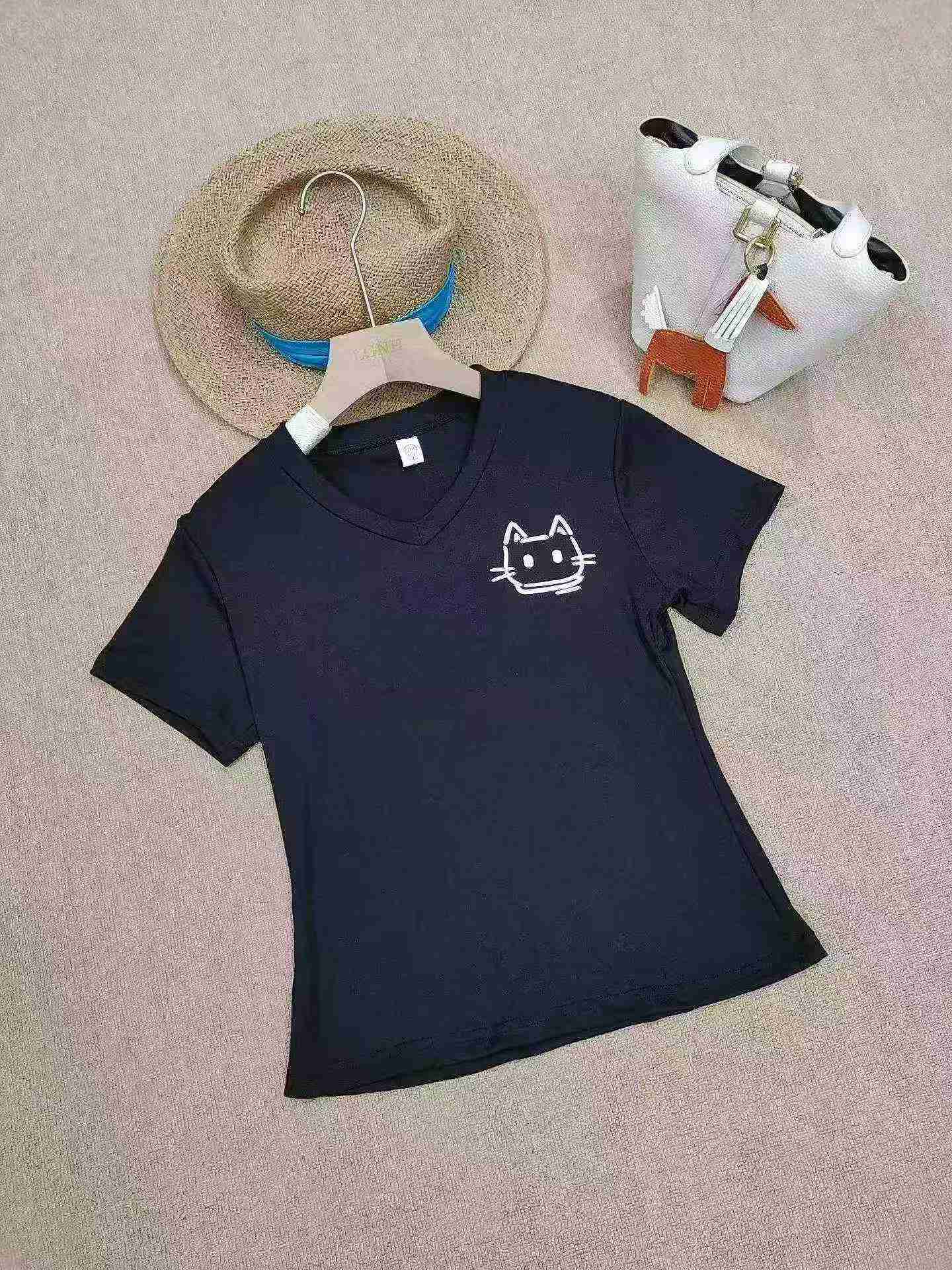 Clearance Stock: 145 Pieces Summer V-Neck Cat Print Regular Shoulder Short Sleeve T-Shirts, 2 Colors, Individually Packed