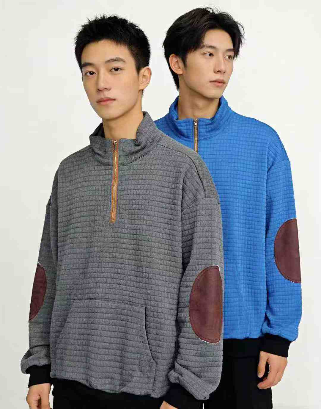 We have 343 pieces of men’s sweatshirts in stock, available in sizes M to 3XL. Mainly gray, featuring loose fit, waffle texture, half-zip stand collar, each comes with individual packaging, now on bulk clearance for wholesale.