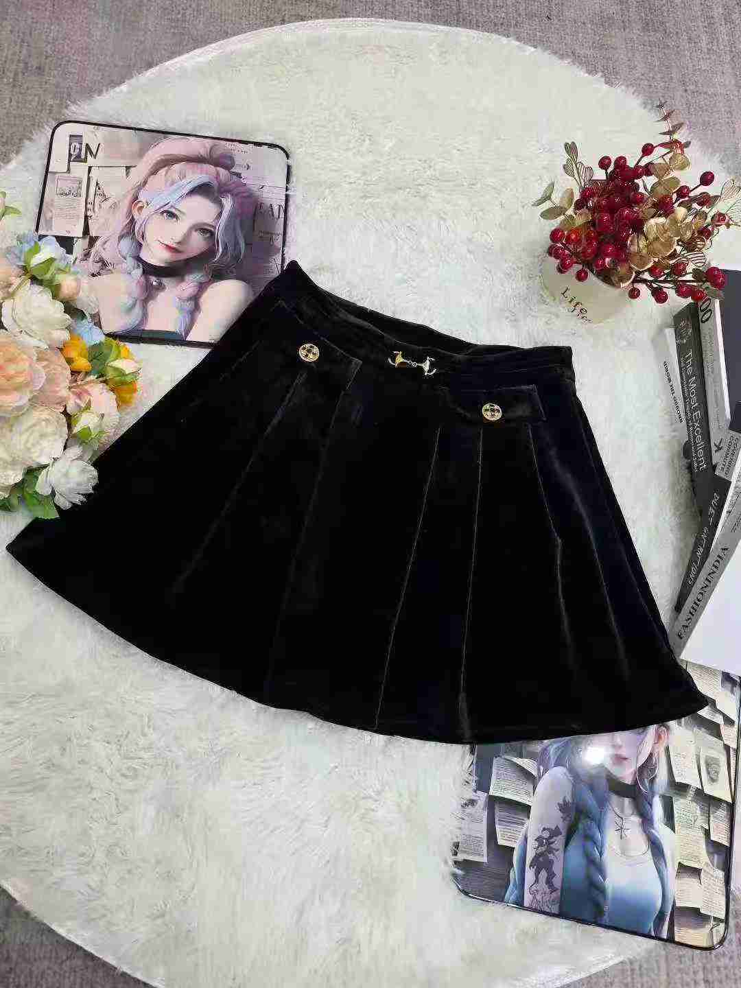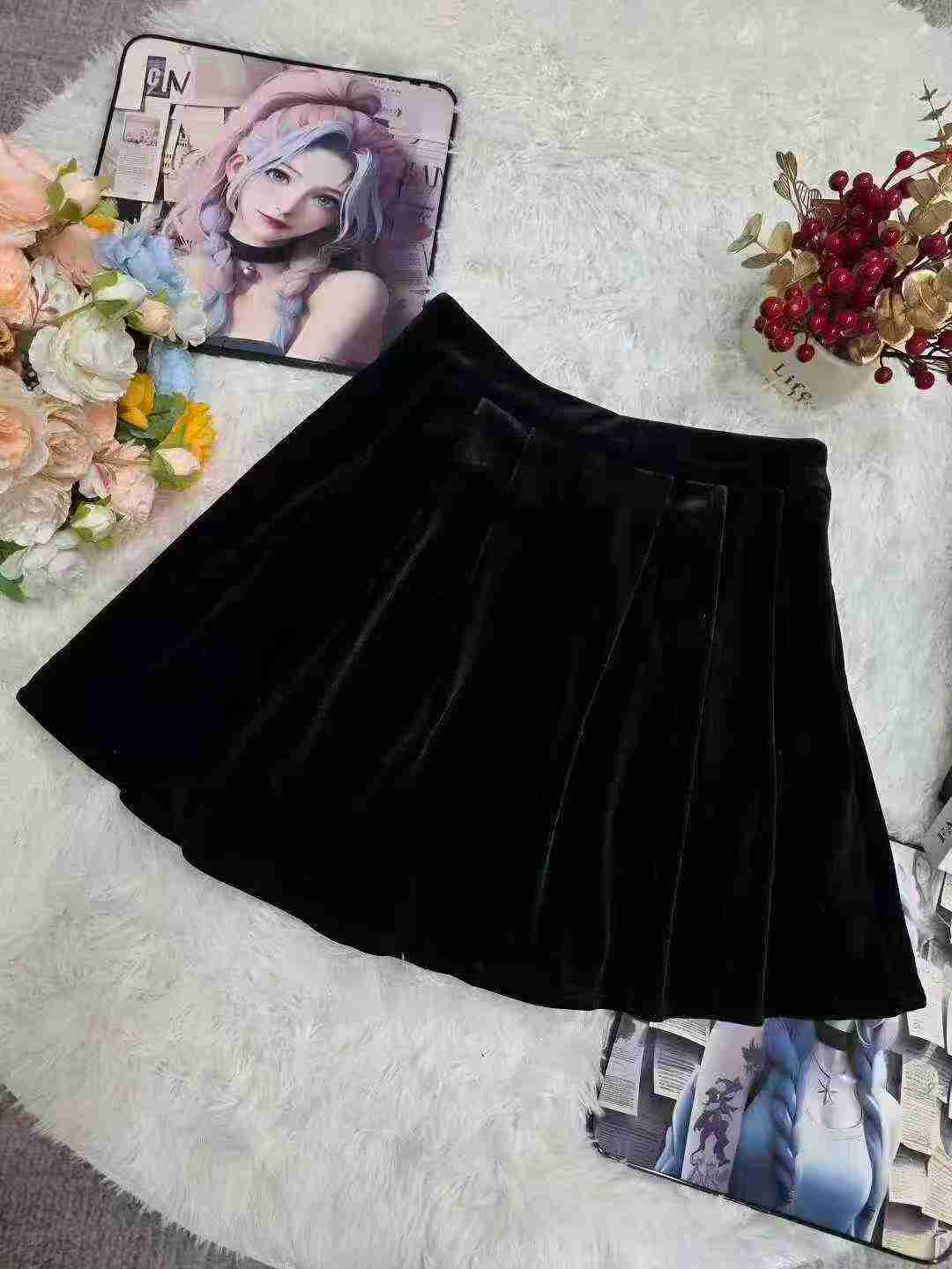 This clothing stock lot offers 265 pieces of black velvet pleated skirts. Features include a high waist, A-line silhouette, lining, and independent packaging with tags. Sizes range from S to 2XL.