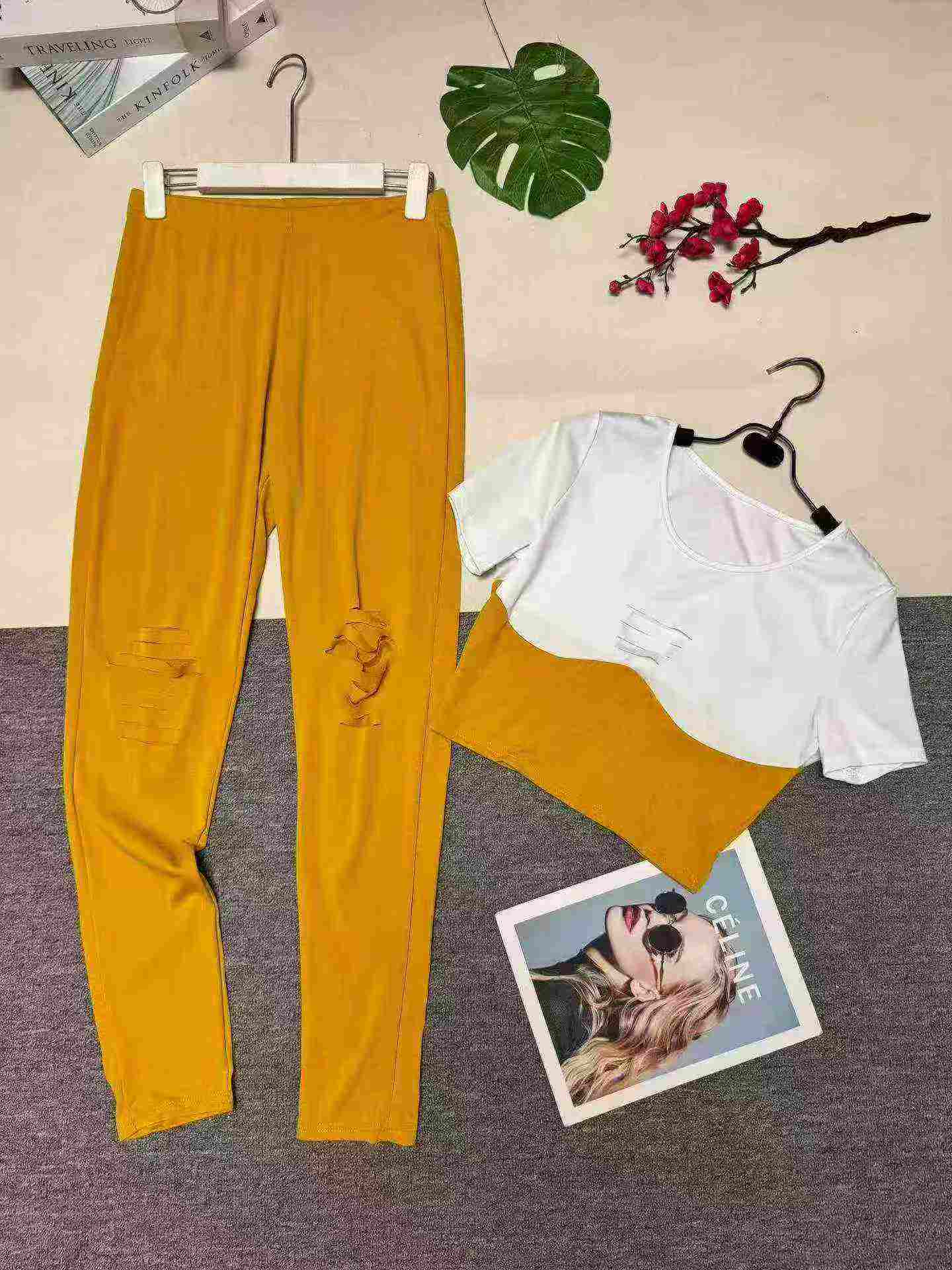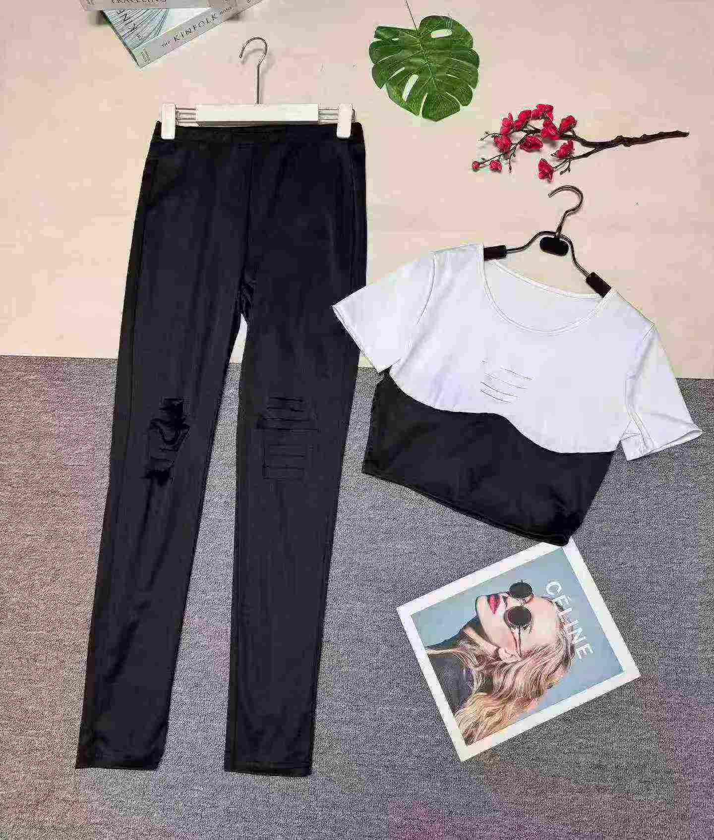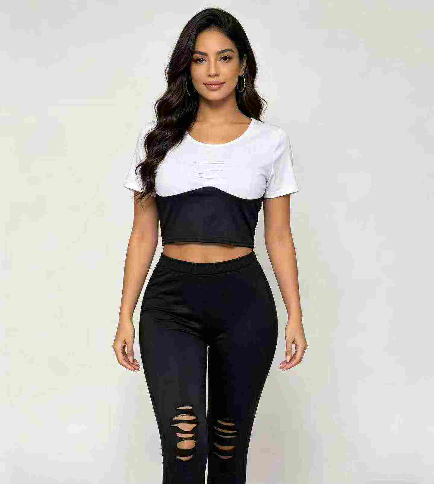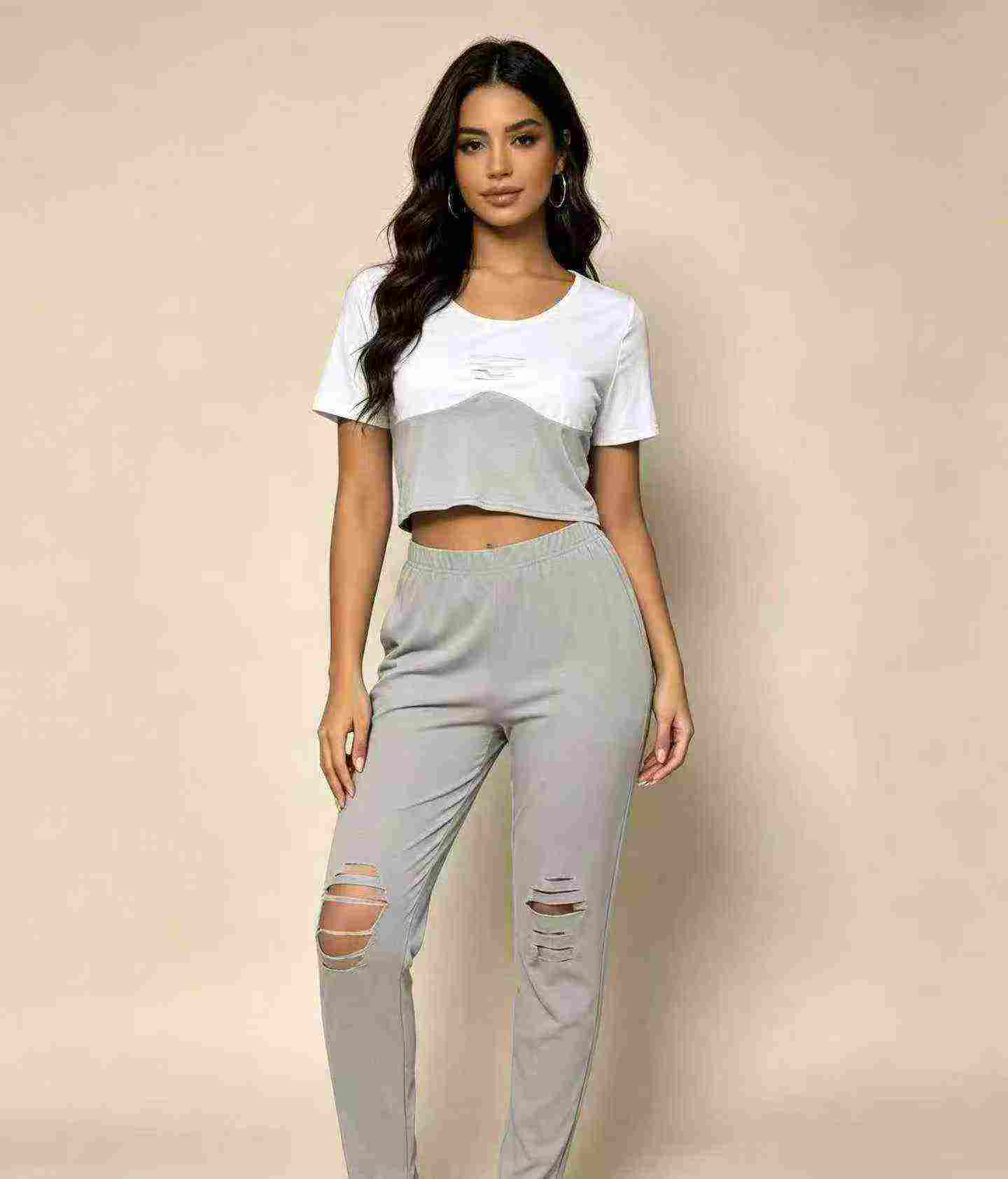 European American Fashion Women’s Casual Ripped 2-Piece Short Sleeve Top & Long Pants, 4 Colors, Approx 390 Sets, Sizes S-2XL