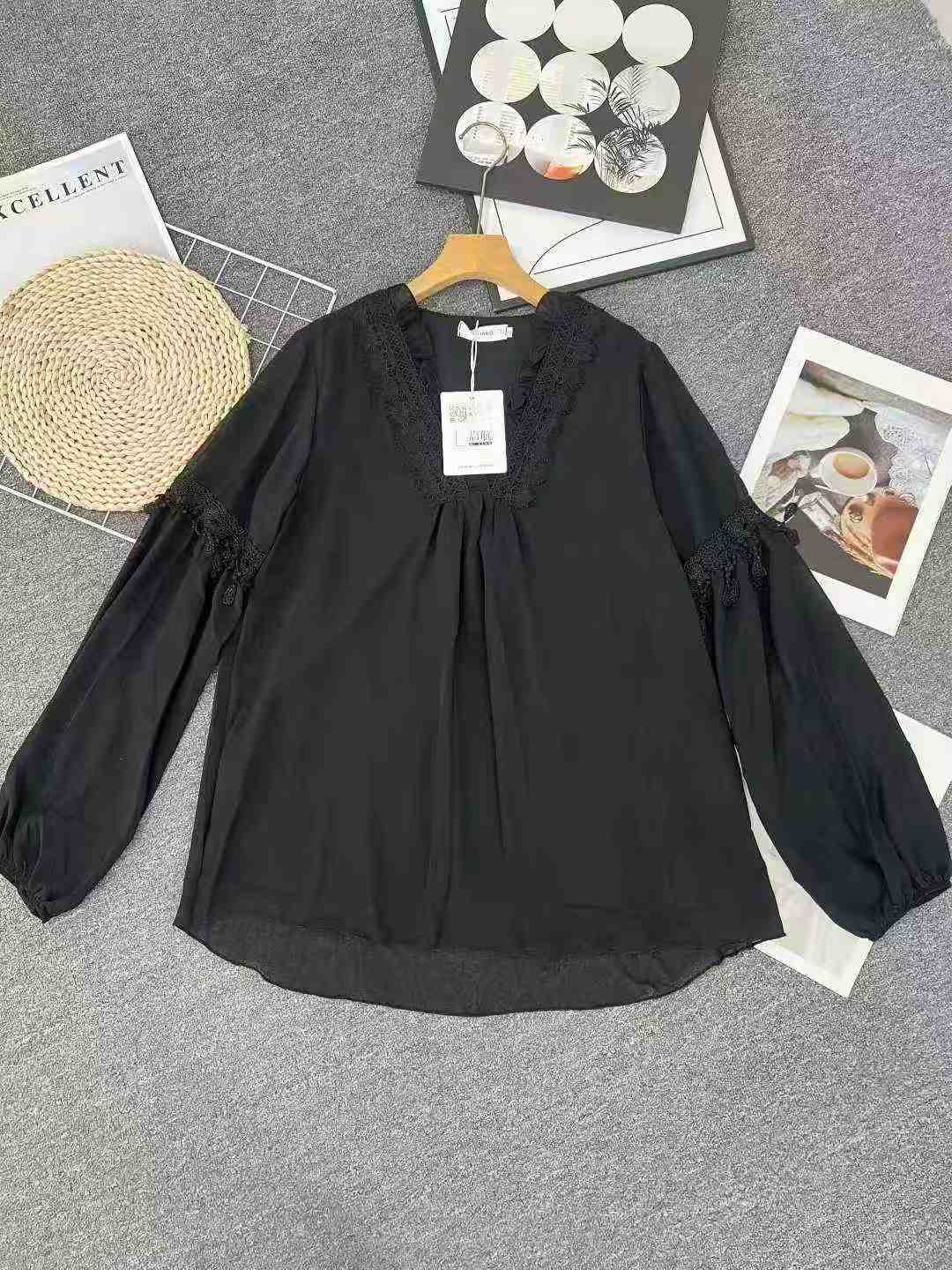 This is a women’s casual loose blouse with European style, featuring black color, V neck, hollow out design, half sleeve, soft chiffon lace fabric, sizes from S to XXL, suitable for spring and summer. 300 pieces total available for bulk clearance.