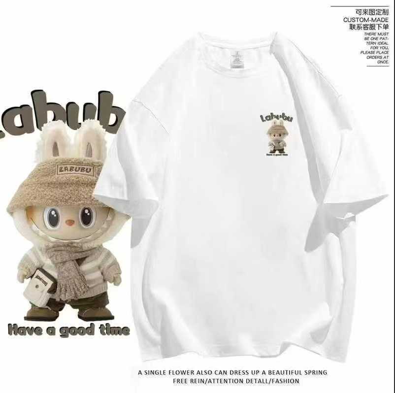 We offer ready stock of popular Labubu print short sleeve T-shirts, available in sizes M to 4XL. Made of 180gsm pure combed cotton, with mixed multiple prints on white base, each is individually packed in frosted bag.