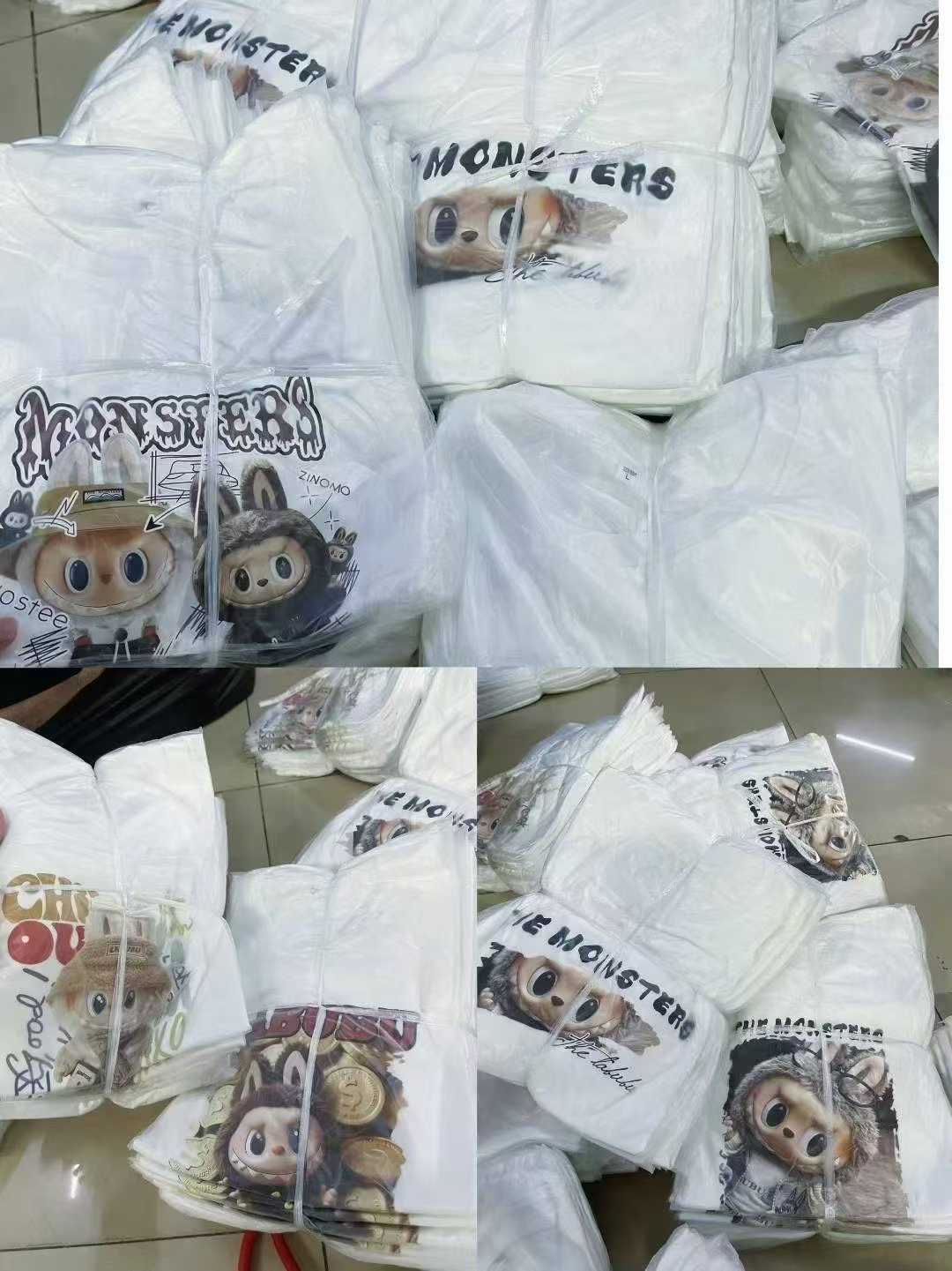 As a professional stock lot supplier, we provide Chinese clothing stock lots for wholesale export. This collection of hot trending Labubu printed short sleeve T-shirts is part of our quality stock clothing offering. Made of 180g pure combed cotton, these T-shirts feature white base with assorted mixed patterns, covering sizes from M to 4XL. Each piece is individually packed in a frosted bag. This is a great value option for bulk clothing wholesale, with ready stock available for immediate order, and the minimum order quantity is 200 pieces.
