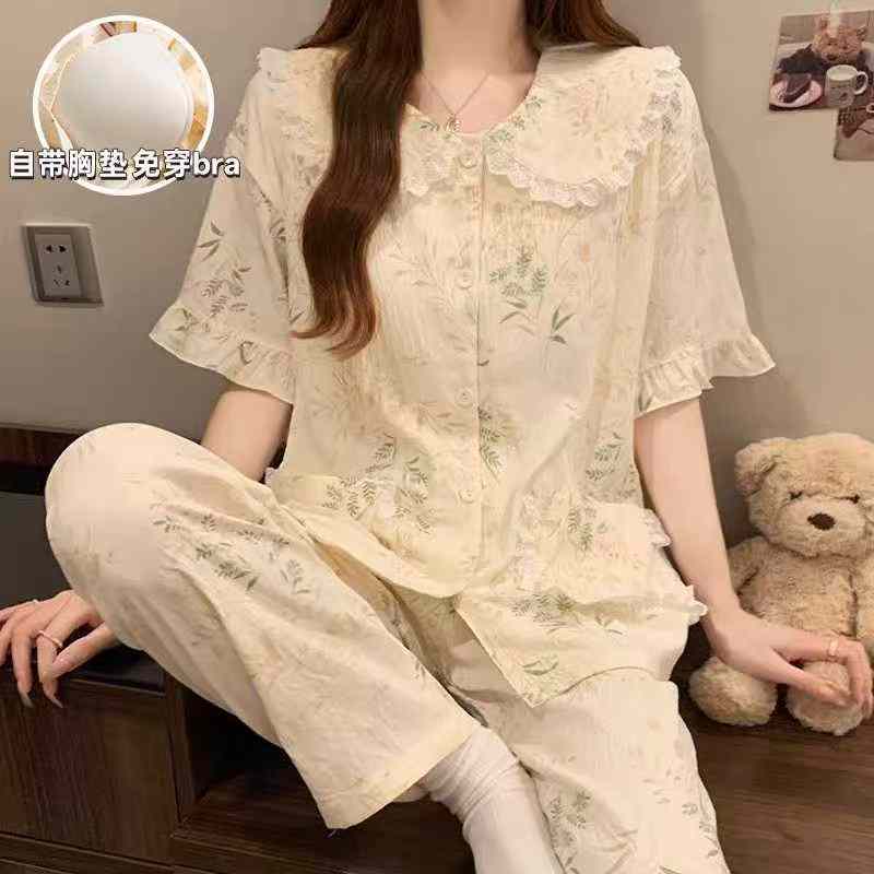 This is a new arrival summer 3-piece pajama set, including short sleeve top and long pants with built-in chest pads. Crafted from cloud cotton, it features doll collar lace design, available in sizes S-XXL, individually packed for bulk wholesale.