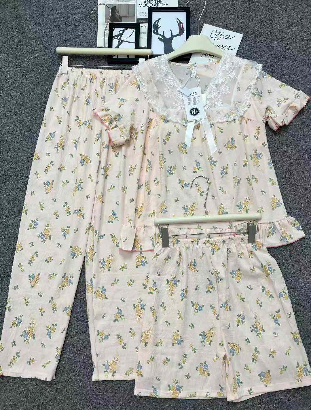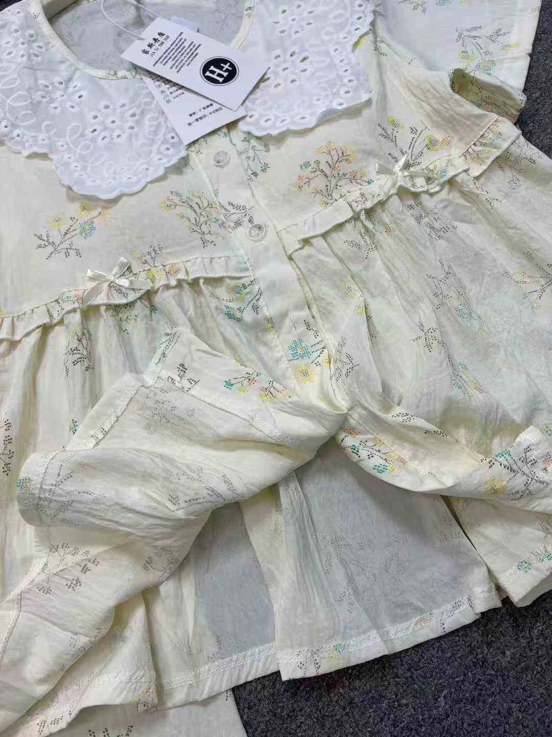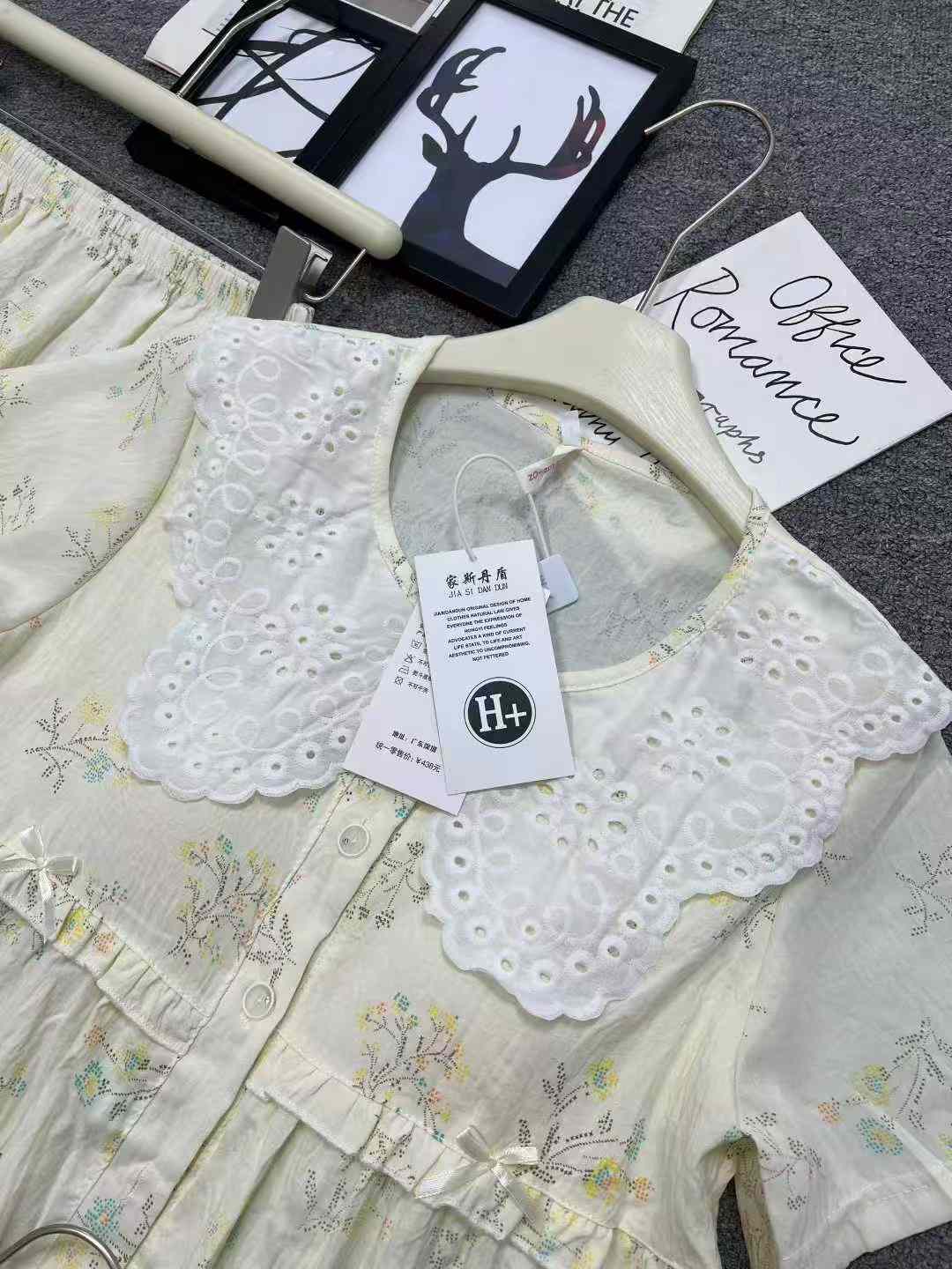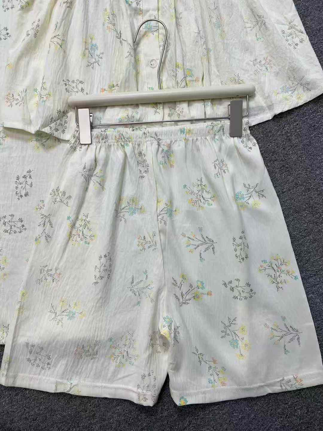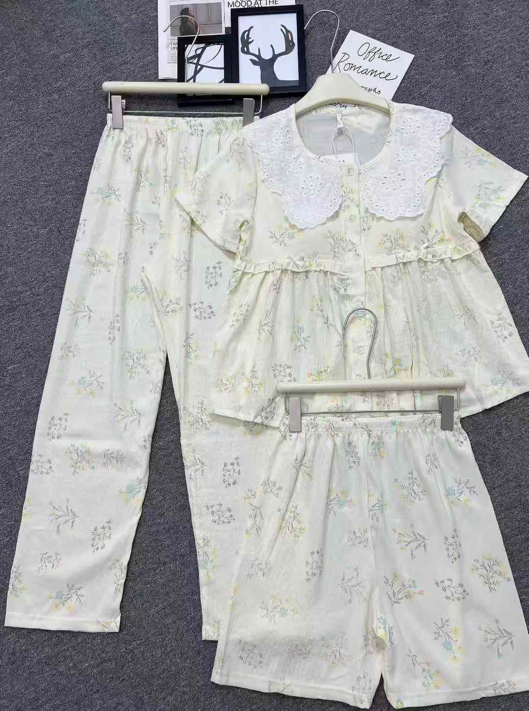 We are a reliable stock lot supplier offering this new arrival summer pajama set as part of our Chinese clothing stock lots for bulk clothing wholesale. This 3-piece set comes with built-in chest pads, including a short sleeve top and long pants, featuring doll collar with lace detail. Crafted from cloud cotton, it can be worn as loungewear or for casual outings. Available in sizes ranging from S to XXL, each set is individually packed with 2 different styles in this whole lot. As a professional provider for wholesale export, we offer this quality stock clothing at a competitive price that brings great value for bulk stock buyers.