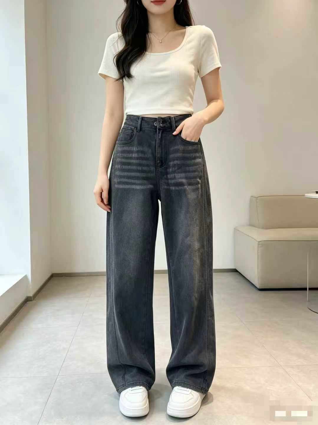 580 Pcs Korean Style Relaxed Retro Vintage High Waist Wide Leg Stretch Grey Denim Jeans Bulk Stock Clearance