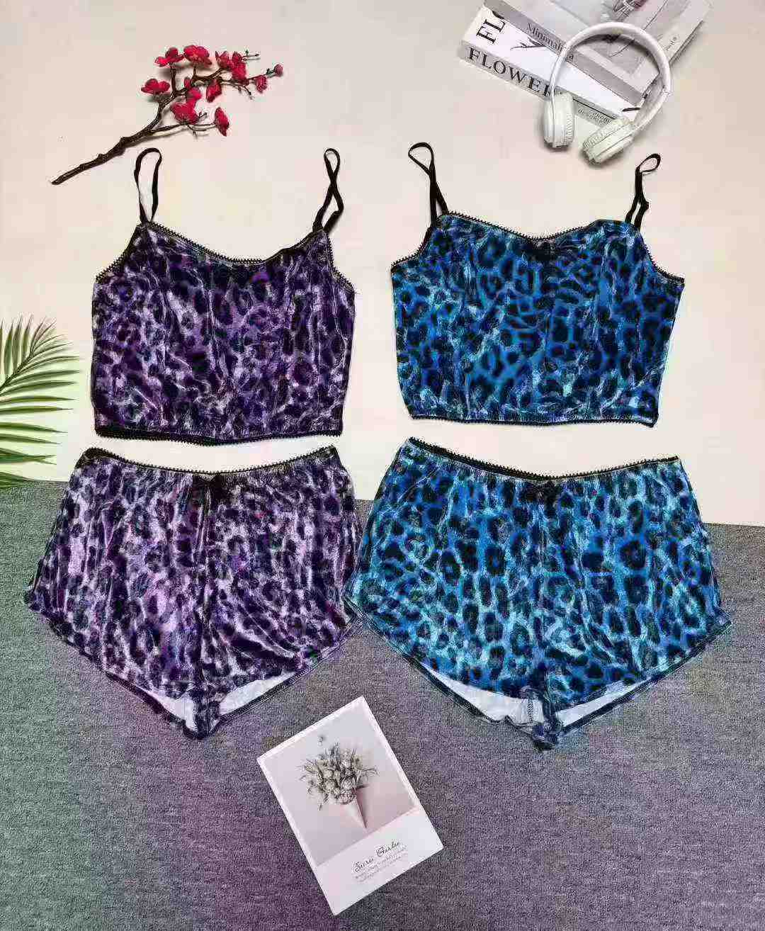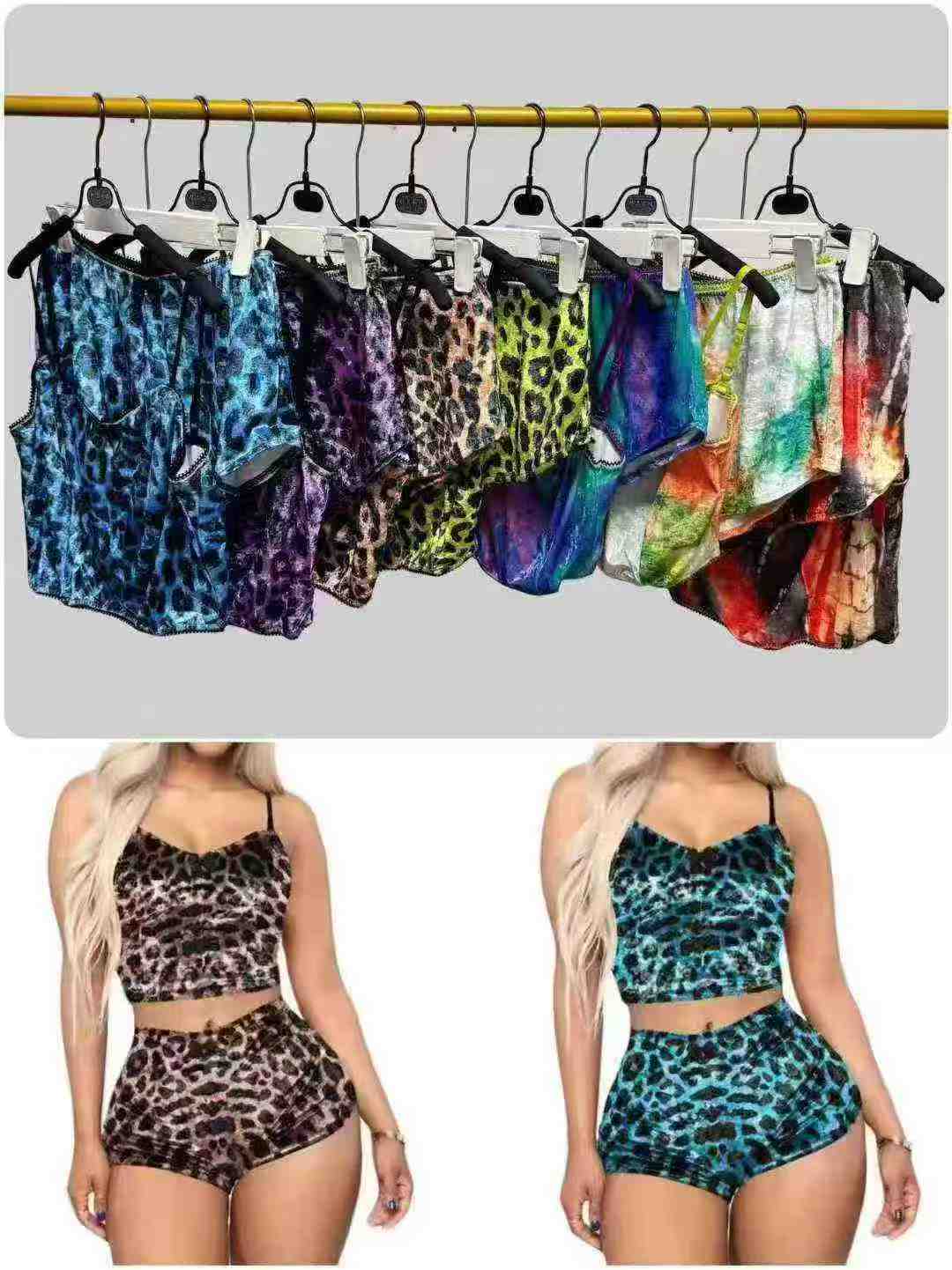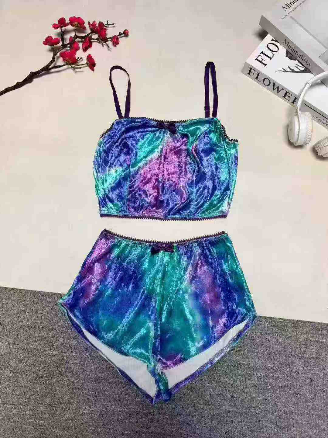 This two-piece set features sexy European & American style, with tie-dye pattern velvet camisole and shorts. Around 421 sets total, sizes from S to 2XL, multiple colors, good quality with individual zipper packaging.
