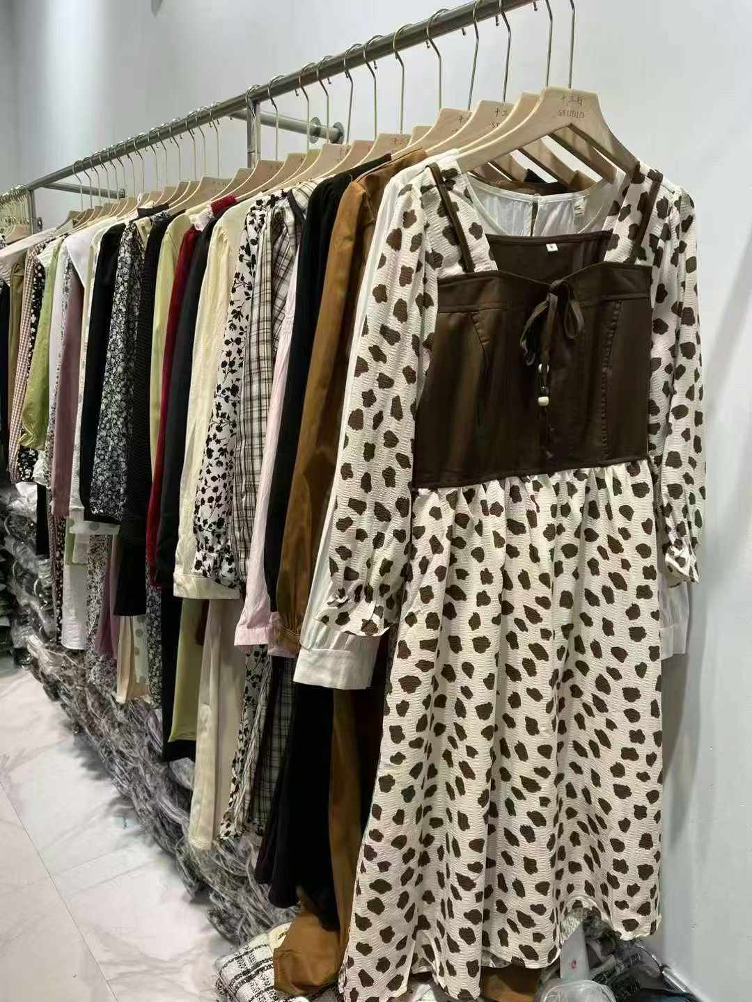 This is a batch of spring-autumn long sleeve dresses designed for young women, with 2200 pieces available in stock. Multiple styles and colors are optional, mixed small and full bulk orders are accepted, each dress comes with individual packaging.