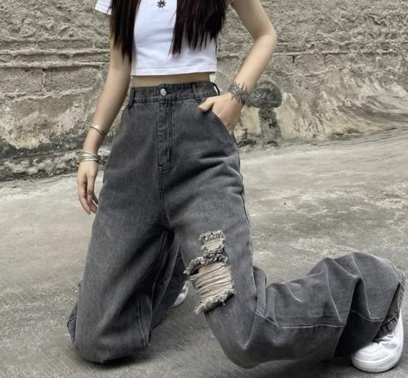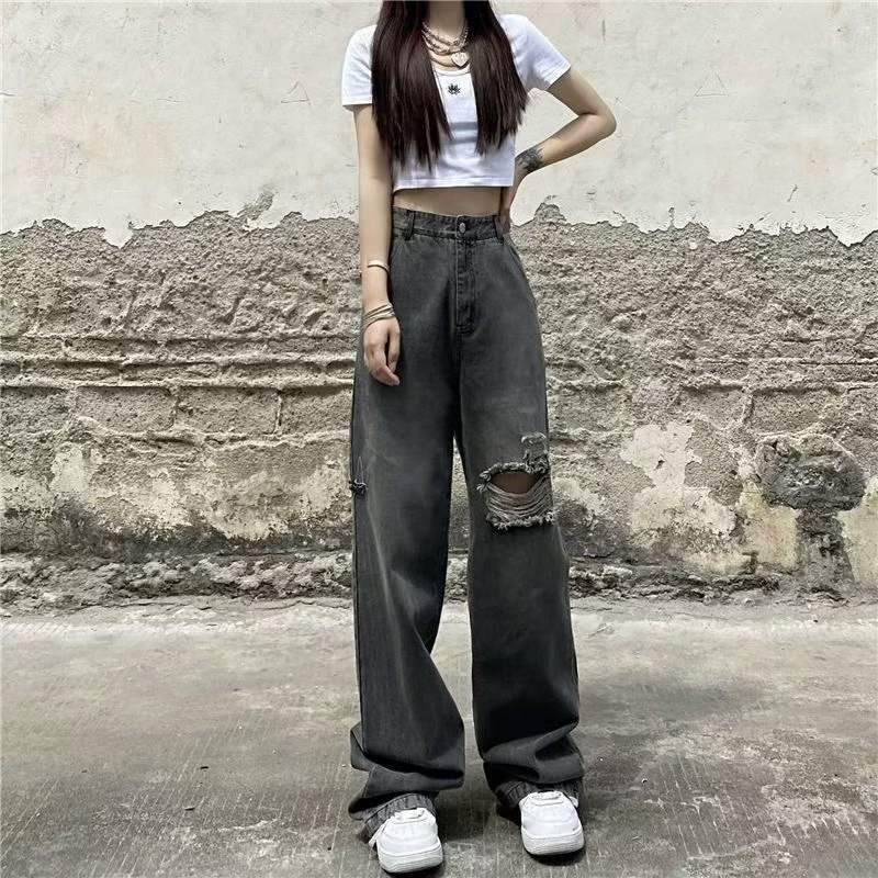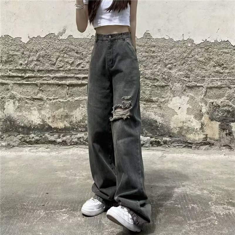 Spring/Summer Vintage Washed Cotton Distressed Straight Wide-Leg Jeans – XS to 2XL, 1072 Pieces, Full Clearance 8.3 CNY/Pc, Independent Packaging with Waist Tag