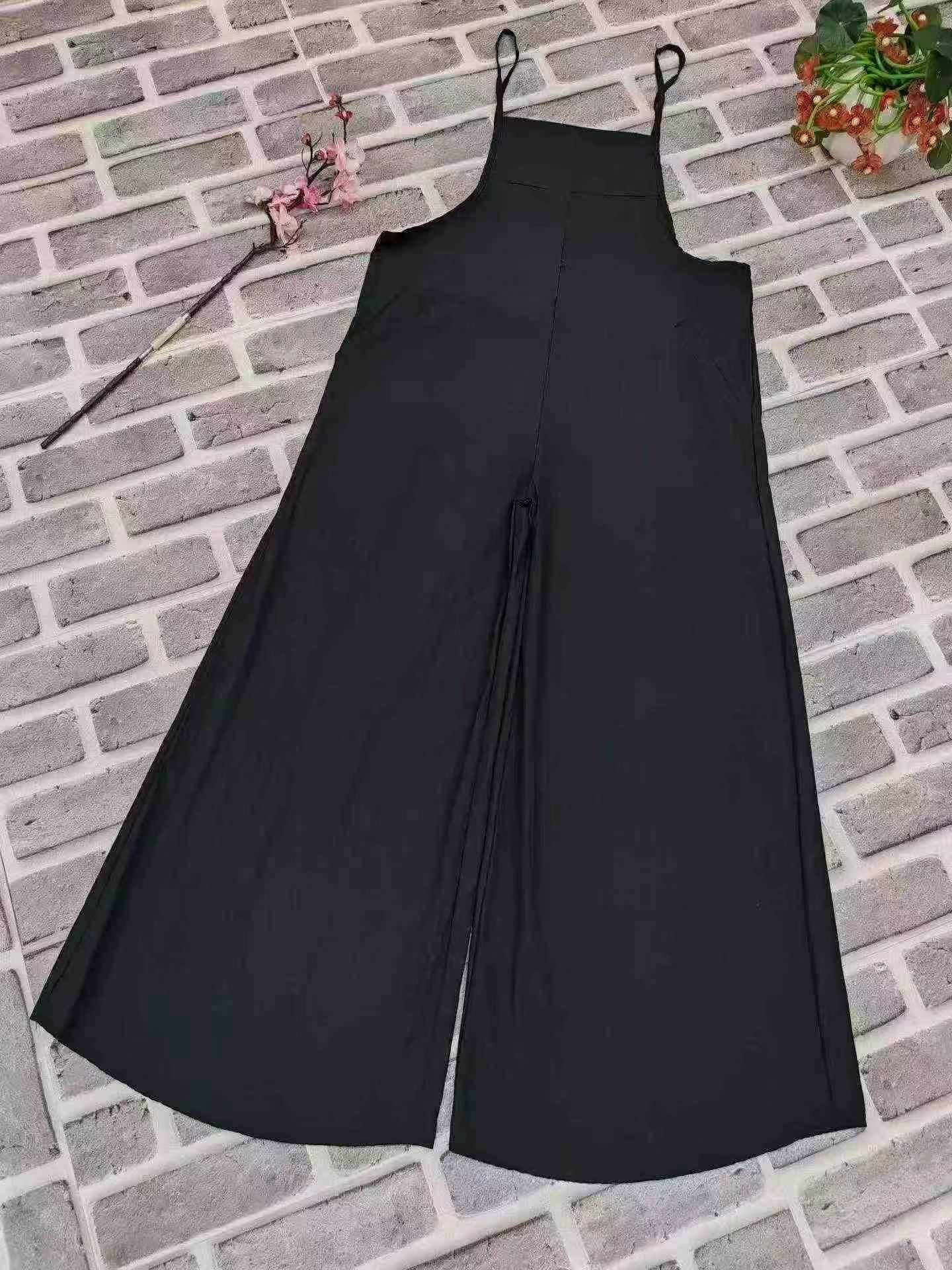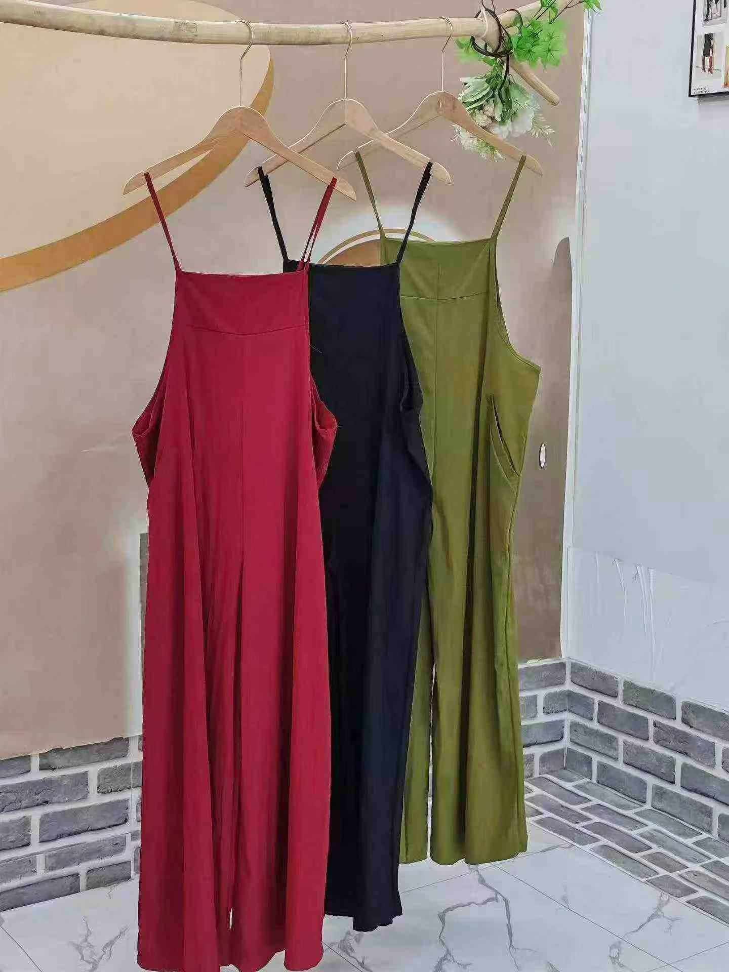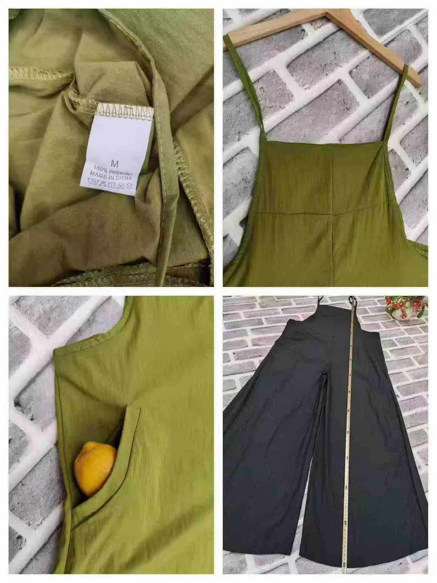 These are wholesale faux cupro wide-leg jumpsuits in stock. Available in sizes S to 2XL with multiple colors (black in limited quantity). Packed 5 pieces per pack, total around 2800 pieces, suitable for bulk buyers.