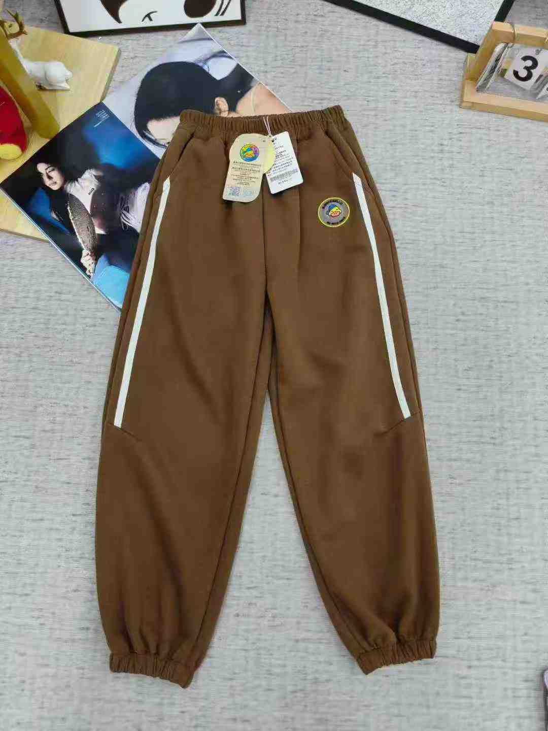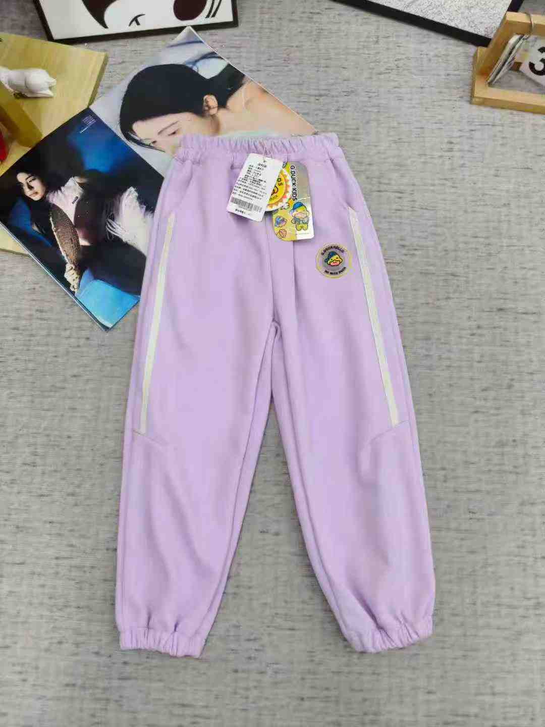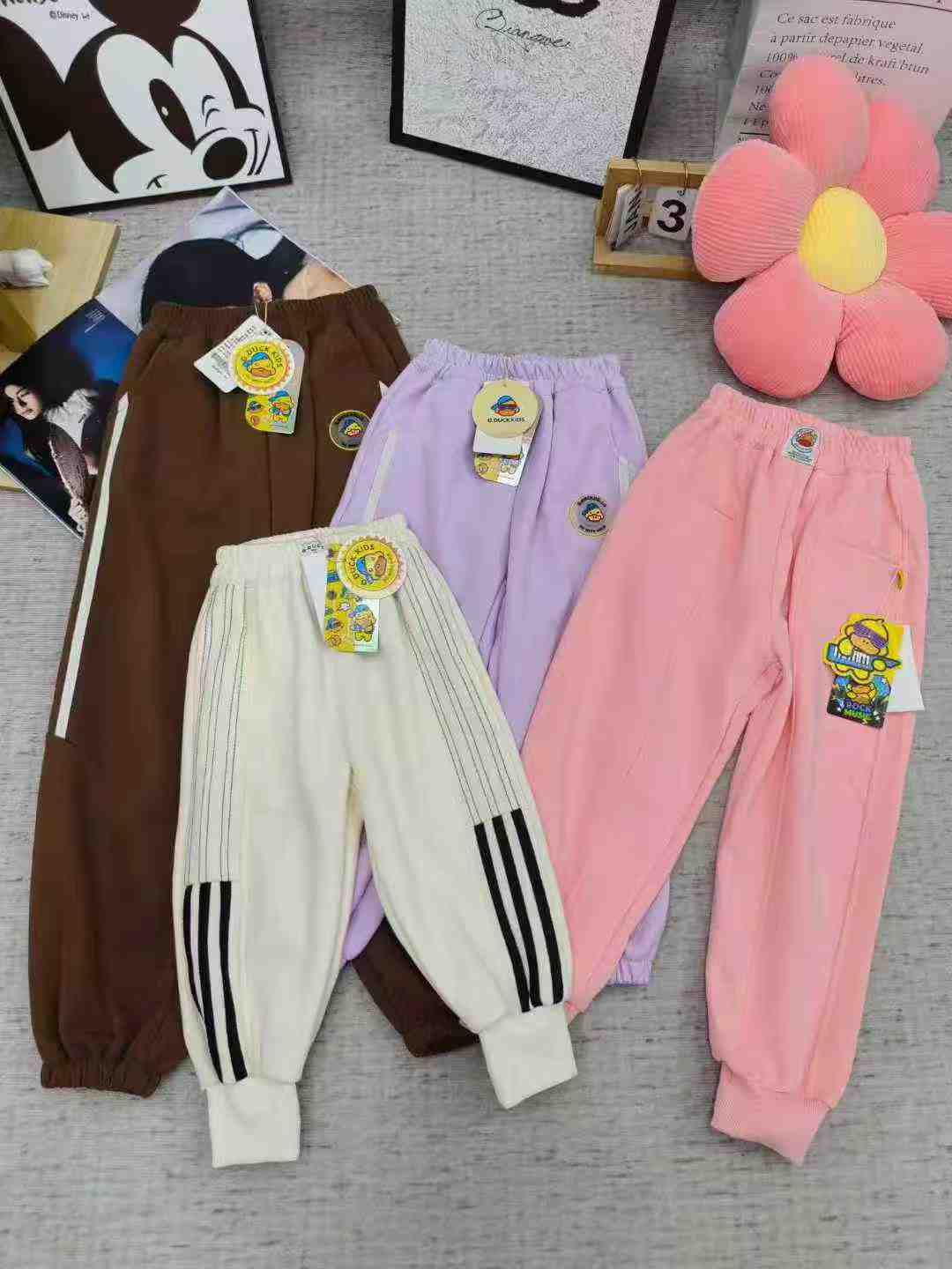 This is a stock lot of 2000 pieces of children’s pants from the Yellow Duck brand. Available in fleece-lined and non-fleece styles, sizes 90-150. Features include elastic waistband with binding, front and back pockets, and independent packing with tags. Main color is pink.