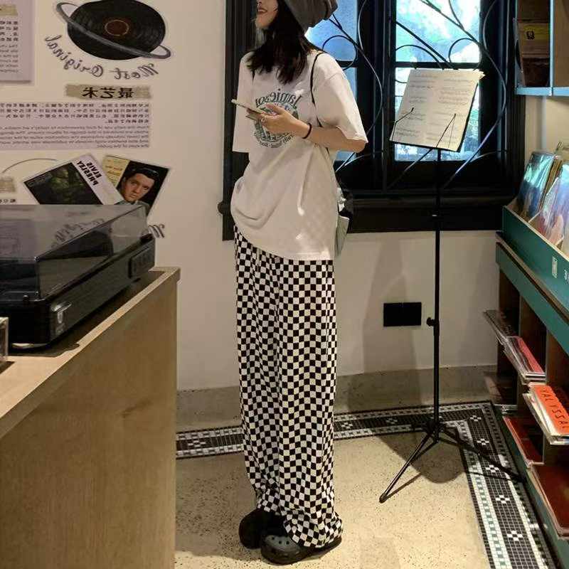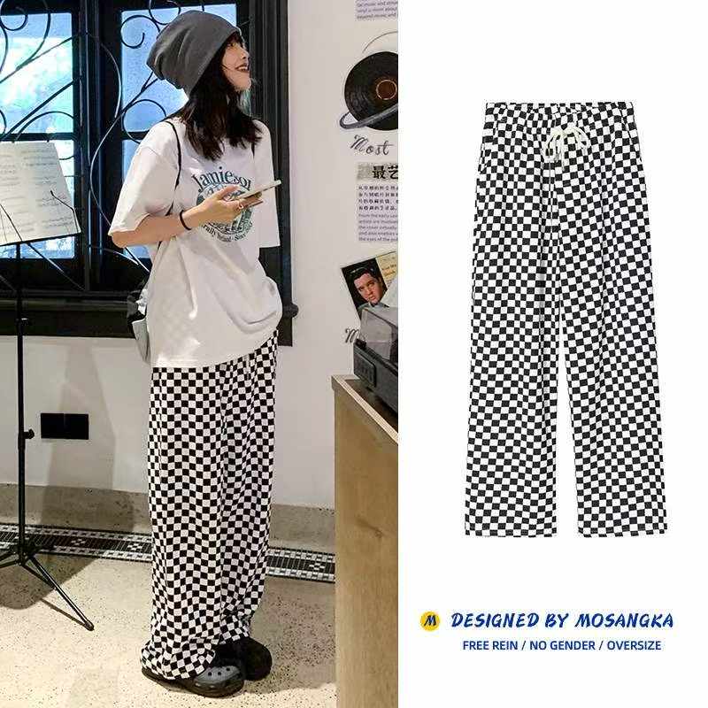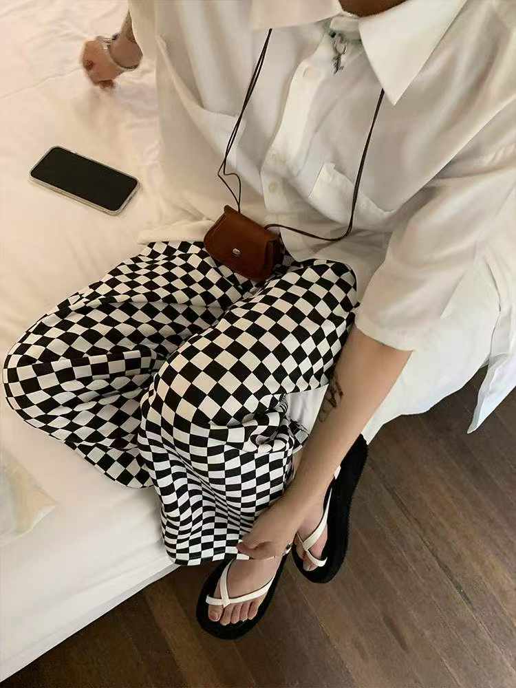 These trendy black and white checkered wide-leg pants feature a retro design and a flowy, straight-cut silhouette. They are suitable for spring and summer, individually packaged, and available in sizes S to L. This is a bulk clearance lot of 100 pieces.