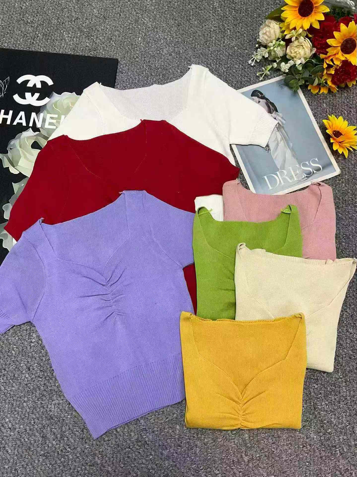 This clothing stock lot features 3330 pieces of summer V-neck knitted tops in a vintage style. The fabric is soft, comfortable, and stretchy. Items come individually packaged.