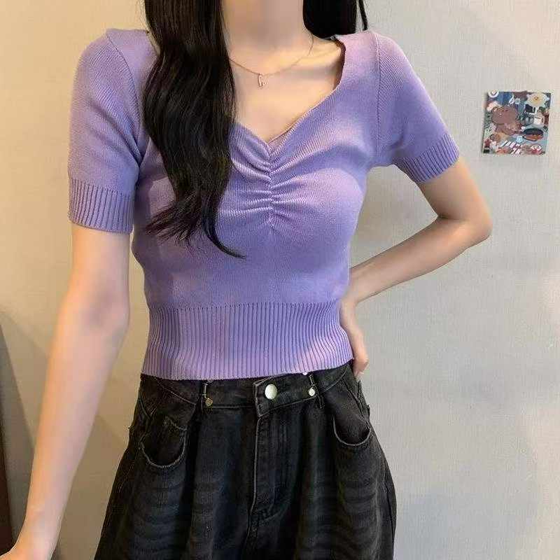 Wholesale Stock Lot: 3330 Pcs Summer V-Neck Ice Silk Knitted Tops, Vintage Design, Soft Stretch Fabric (Bulk Clearance)